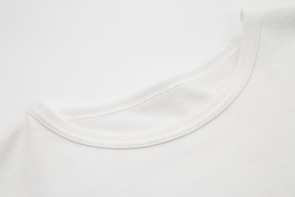 お気に入りのTシャツの首回りが伸びてしまった経験のある方は多いかと思いかと思いますが、バインダーネックは耐久性に優れ伸びにくいため長く着用できる仕上がりとなっております。