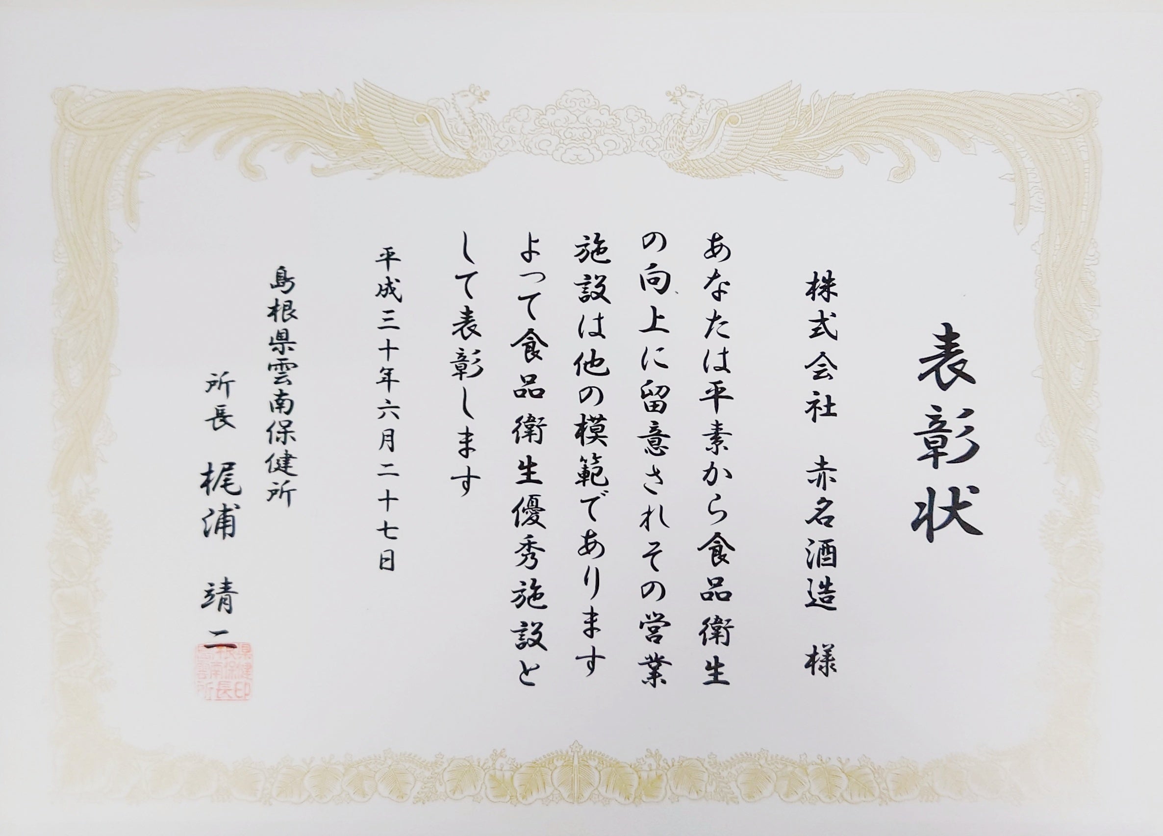 2018年 島根県雲南保険所長より食品衛生優秀施設表彰受賞