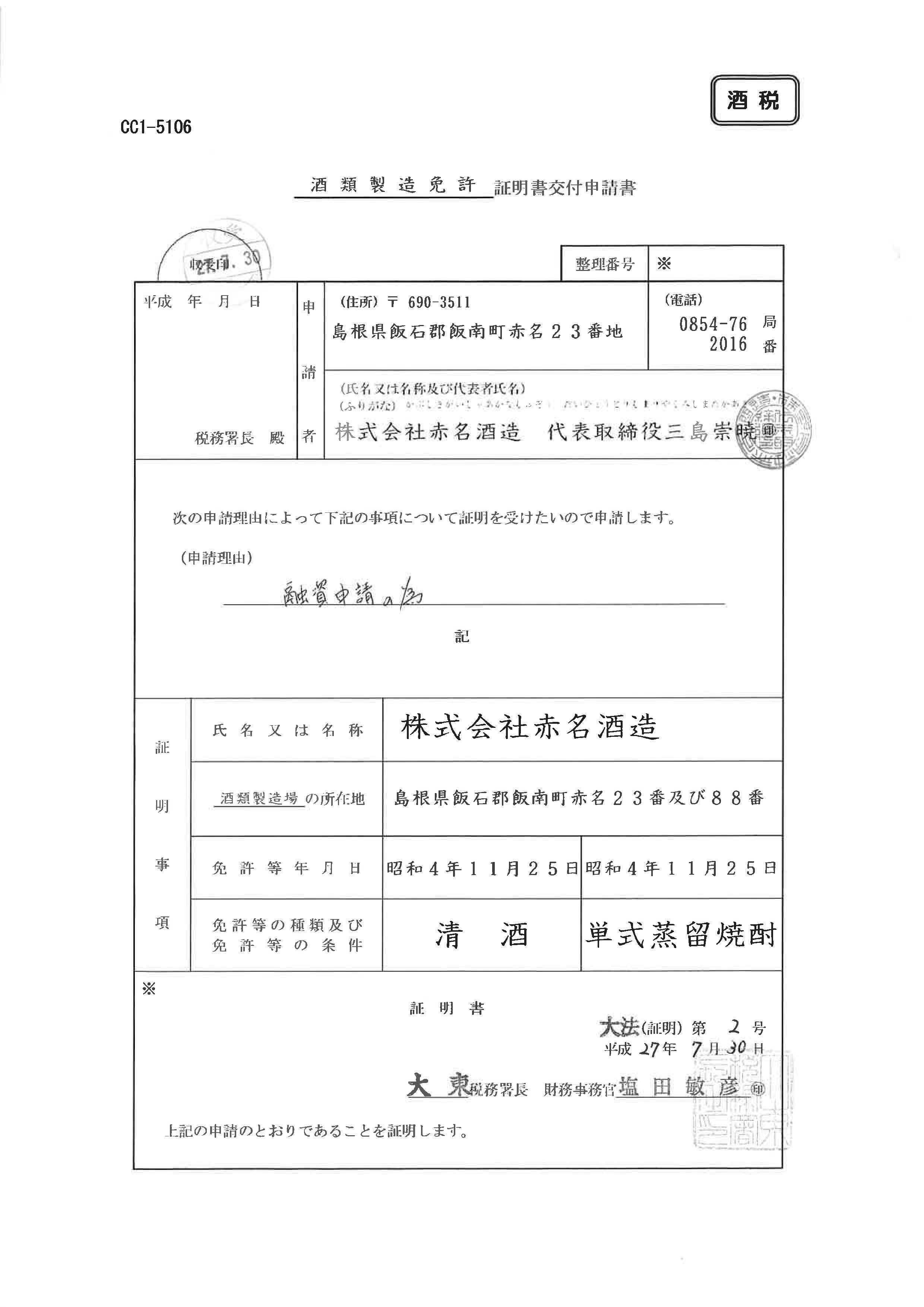 当社の清酒の販売免許は酒類製造免許に付帯していますので酒類販売免許番号は保有していません。