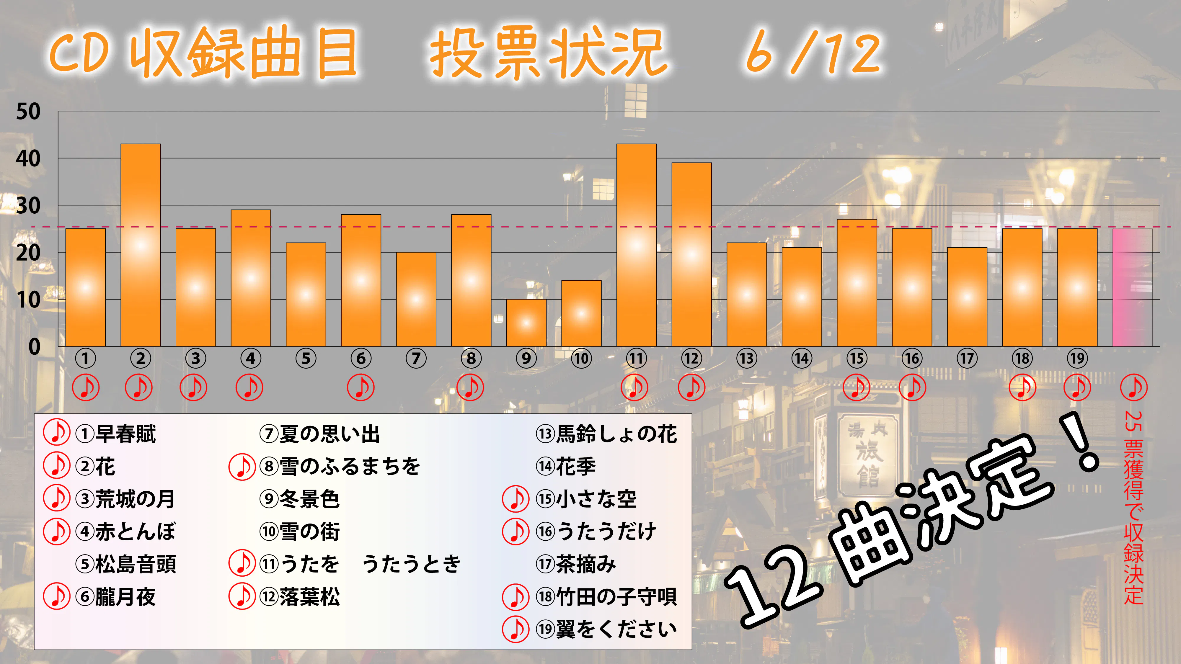 推し曲投票も本日新たに2曲、CD収録曲目として決定致しました。「うたうだけ」「竹田の子守唄」です♪どちらも山中惇史さんのアレンジが光っており、「うたうだけ」はジャズ、シャンソン、ブルースの要素が取り入れられ、大変洒落た素敵な仕上がりとなっております。今までの日本歌曲のCDとは一味違う、そんな1曲です。「竹田の子守唄」は、全体をあえて歌い上げず、アレンジしすぎず、シンプルで美しい作りとなっております。ですが、最後のオブリガートは転調したピアノ伴奏から徐々に盛り上がり、歌が加わり、心をぎゅっと掴まれるような哀愁に満ち溢れたアレンジで感動的なラストに仕上がっております。