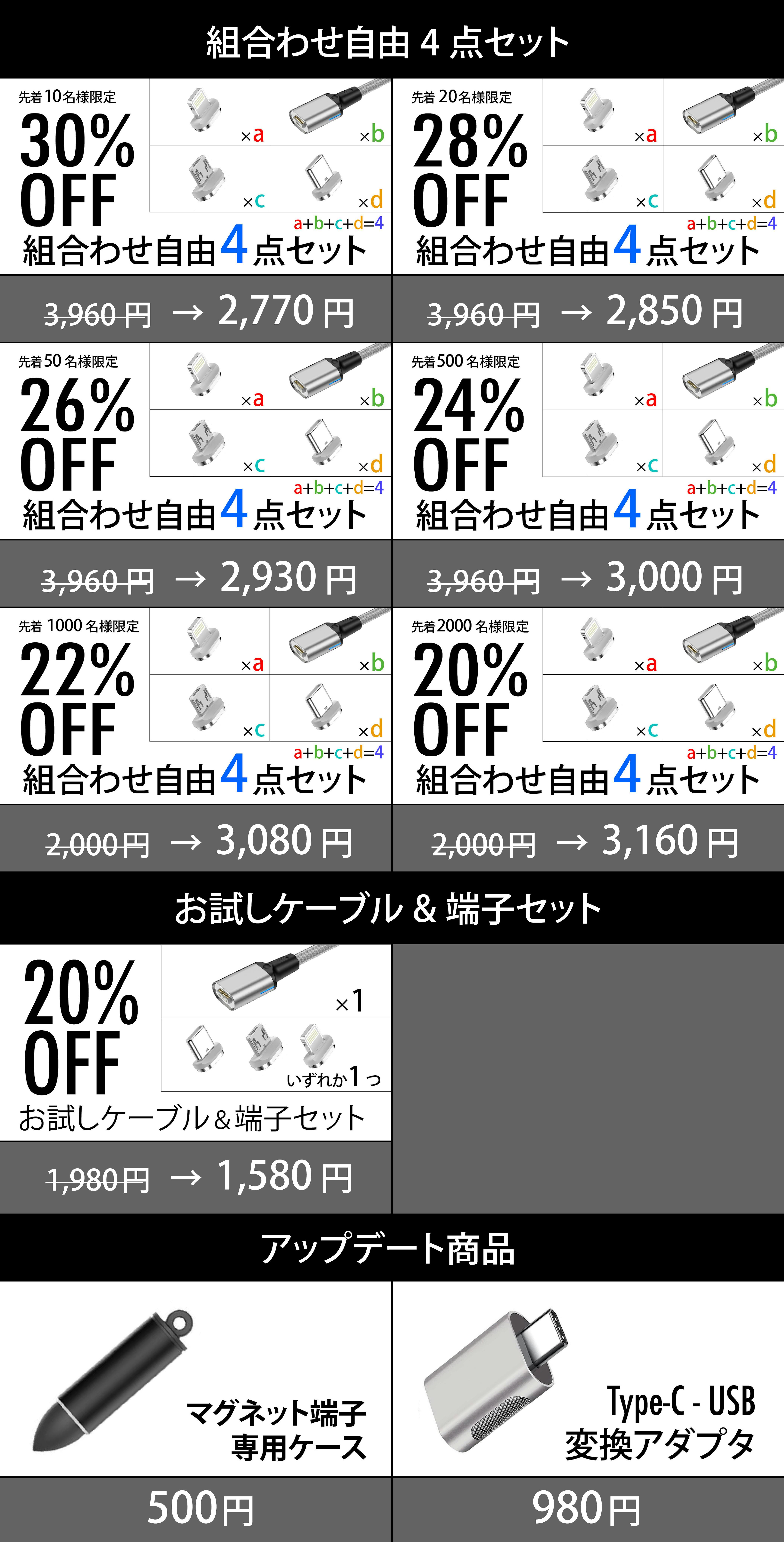 今回は、皆様のご使用端末に適したリターンをお選びいただけるよう、端子とケーブルをお好きな組み合わせでご選択いただけるリターンを用意させていただきました。