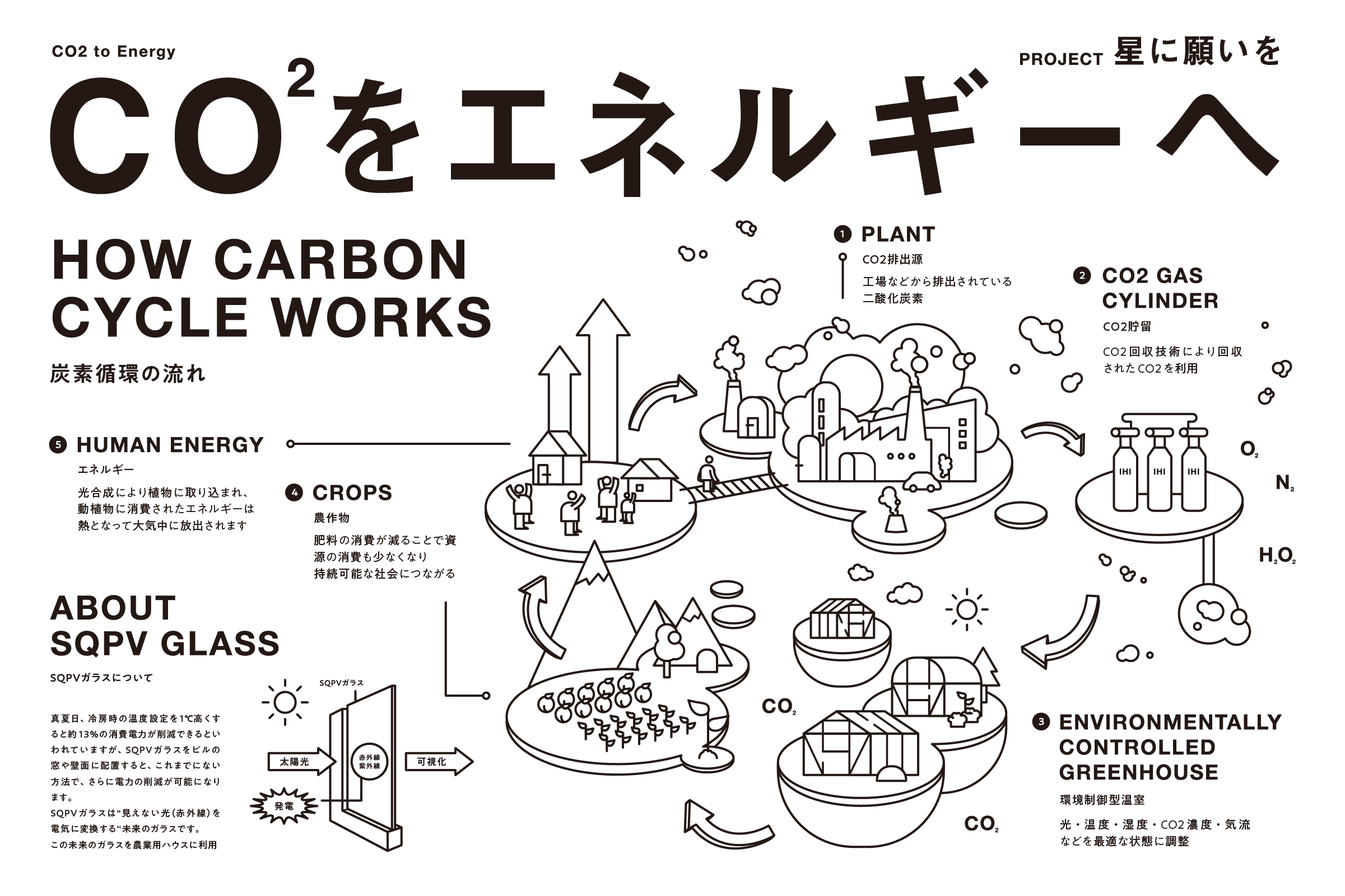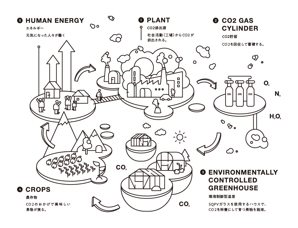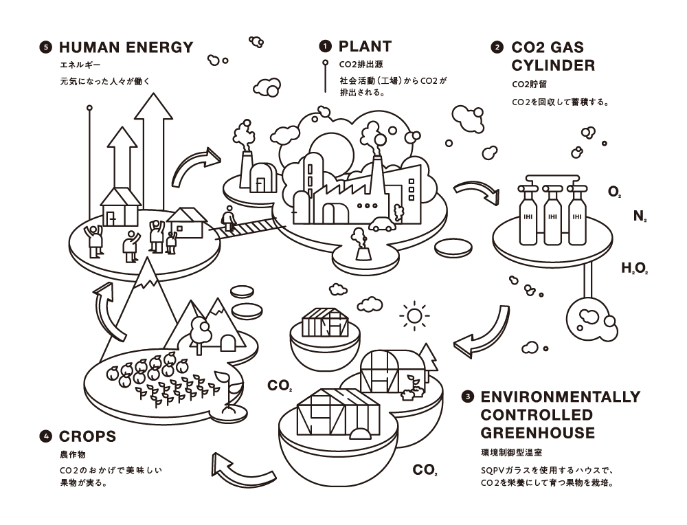 そんな時、2つの技術革新の話が飛び込んできました。1つはカーボンリサイクルの開発が進み、工場から排出されるCO2を回収する技術が商用化されたこと。もう1つは、ハウスの建設資材として赤外線を電気に変換する「sqpvガラス(無色透明発電ガラス)」が販売されたことです。