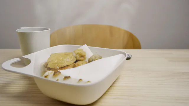 プレートの立ち上がりの曲率とスプーンの曲率を同じ形状にすることによって、カレーなども残さずに掬うことができます。生ゴミを減らすこと、これも大事なエコロジーです。