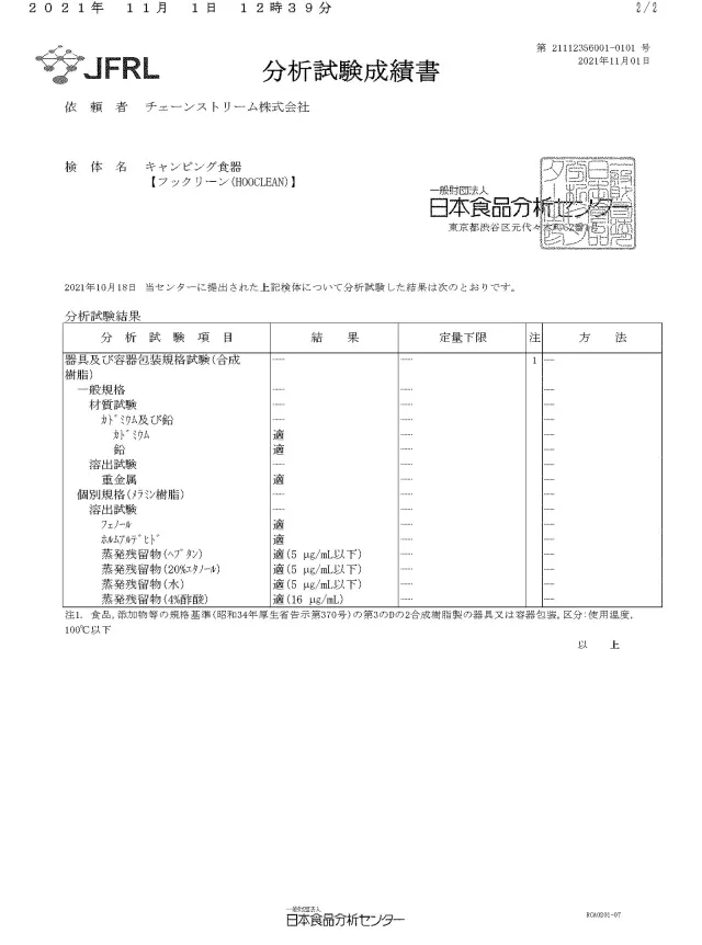 フックリーンは【合成樹脂性の食品容器包装向け規格試験】において、全ての項目をクリアしており、安全にご使用いただけます。