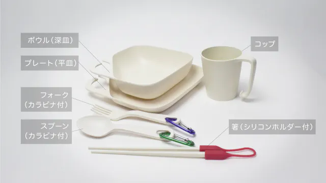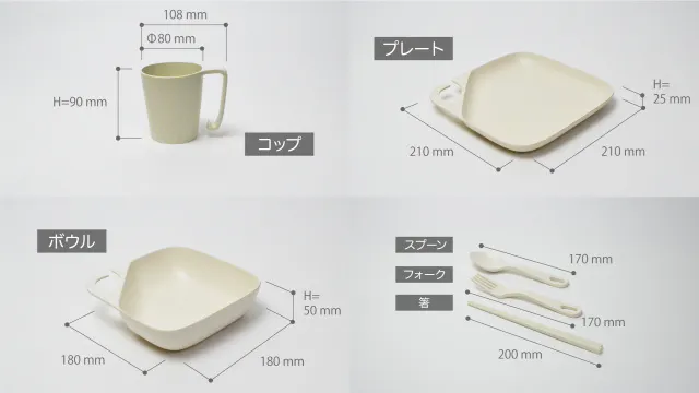 セット内容は、プレート(□28cm)、ボウル(□20cm)、コップ、カトラリー(箸、スプーン、フォーク)。