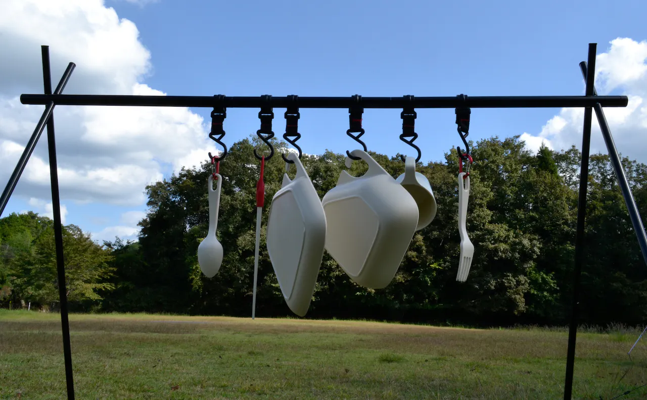 また、タープなどのロープに引っ掛けておくことで、撤収の際に忘れてしまうこともなく紛失の危険性も下がります。