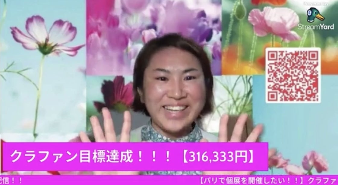 クラファン3日目!2/26の20:40。ついに目標金額の30万円を達成しました!!達成の瞬間の感動を共有したく、ライブ配信を行ったのですが、配信中に4件ほどご支援頂き、無事Successすることができました!*ちなみに、達成の瞬間のご支援者は、大学生の女の子でした。幅広い世代の方に応援いただけて本当に励みになります!!その後も何件かご支援頂き、現在39名の方から合計【324,333円】で108%達成となっております!今後はストレッチゴールを設定。50万円で明日からは走り出します!!資金の使い道は・・・展示作品点数を増やす、パリに日本の文化をお届けする、ご来場の方に何かをお配りする…など、周りの人にも還元できるようなリターンを考えていきたいと思っています。あとはパリの人をどうやって呼び込むか…これも早急に考えなくては。私は意外と負けず嫌いで、「出来ることはなんでもやる!!」というマインドになる時がたまにあり、クラファンにはそれがかなりプラスに作用しています。でもやったらやった分の成果が出るので、私も意外と楽しんでいます!配信とかYouTubeは、クラファンやってなかったら一生はじめる機会なさそうだったし。笑というわけで、3日目に目標の30万円達成報告でした!現時点でご支援いただいた39名の皆様、本当にありがとうございます!!!