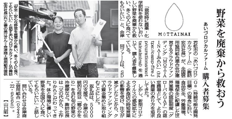 毎日新聞社様に、WEB版に引き続き、本日の福島版の朝刊にこのプロジェクトのご紹介記事をご掲載いただきました。