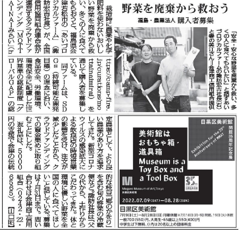 毎日新聞社様に、WEB版、福島版の朝刊に引き続き、7/23(土)都内版の朝刊でこのプロジェクトのご紹介記事をご掲載いただきました。