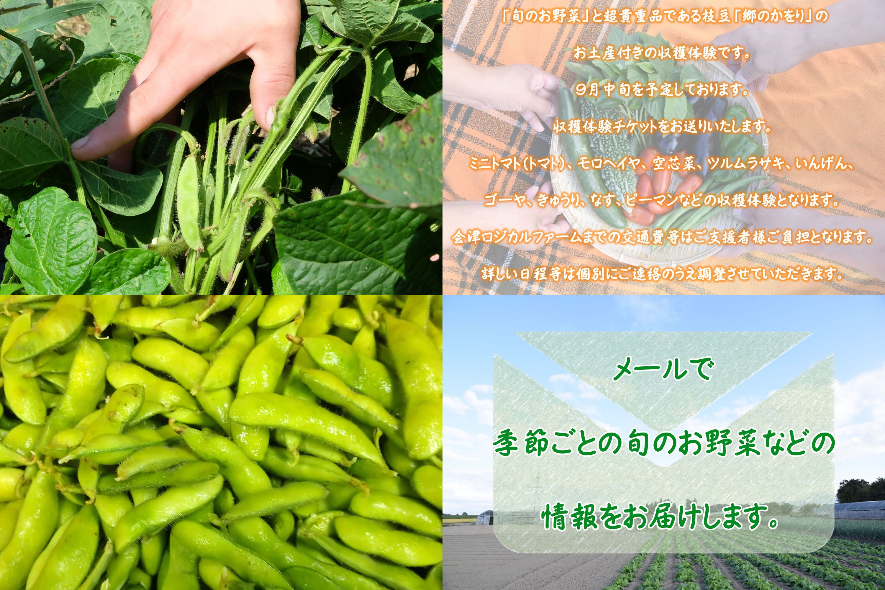 ・「旬のお野菜」と会津の伝統野菜のひとつでもある「かおり枝豆」のお土産付きの収穫体験です。