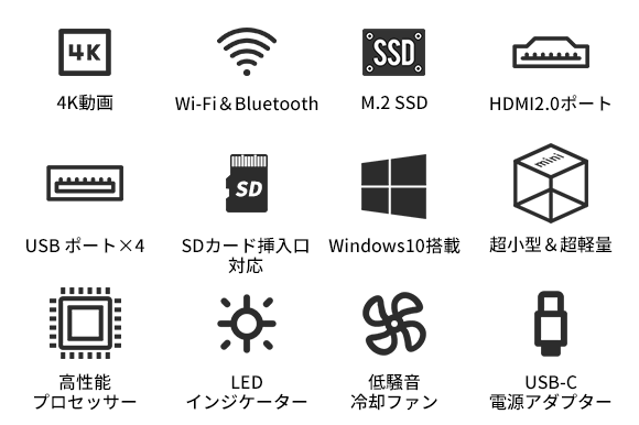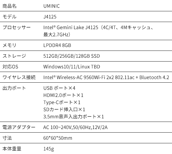 わずか60×60×50mmの「UMINIC」は、プロセッサーにはコスパに優れたIntel® Gemini Lake J4125(4C/4T、4Mキャッシュ、最大2.7GHz)を搭載しながら、4K/60Hz対応のIntel UHD Graphics 600を内蔵しているため、ハイビジョンな動画視聴再生や文書作成などもサクサク快適に!