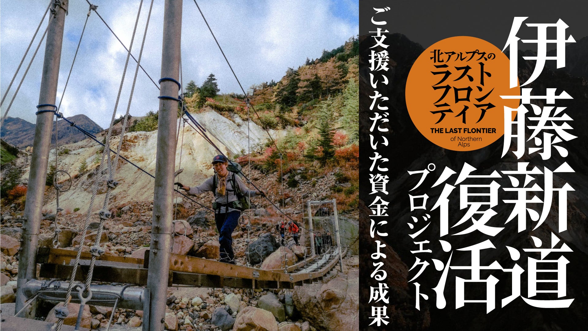 2022年5月から8月に立ち上げた、当プロジェクトのクラウドファンディングにより、皆様より13,576,100円という予想を遥かに超えるご支援を頂きました。この資金によるプロジェクトの進行状況は以下の通りです。1. 8月17日に鉄砲水により損壊した第一吊り橋の補修 9月16日最大の増水を3メートルと見込んで架橋した第一吊り橋でしたが、8月17日に10年に一度の災害とはいえ4メートルほどの鉄砲水にあい、あえなく損壊。オリジナルの吊り橋が水面より7メートルに架かっていたことを思うと、当時の架橋が余程慎重な調査と予測に基づいたものだったことが偲ばれます。踏板のレベルを限界まで上げて復旧しました。2. 第二吊り橋(旧第三吊り橋)架橋 10月1日~3日第一吊り橋の損壊を踏まえ、オリジナルより1m近く高い位置に架橋しました。素材も湯又渓谷一帯に浮遊する硫化水素による腐食を意識して、出来る限りステンレス製とし、美しい吊り橋となりました。真ん中から見下ろす激流は中々の迫力です。3. 第三吊り橋(旧第五吊り橋) 10月12日 、13日道中一の絶景を誇る硫黄尾根噴気地帯直近にある第三吊り橋ですが、やはり濃度の高い硫化水素に対して、ステンレスとドブ付けされたヒノキを使用し、揺れの少ない立派な吊り橋となりました。4. ガンダム岩タラップ設置昨年重大事故が発生し、通過の仕方によっては危険の伴うガンダム岩にタラップを設置し、気を付けて通行すれば水量の多い日でも通過できるようになりました。今年のプロジェクト進捗状況は以上ですが、厳冬期の積雪、雪崩、融雪期の大増水などまだまだ予測不能な要素があり、見守っていく必要があります。また、来年は峠の茶屋への避難小屋の建築、第一吊り橋上流のスラブへの桟道の設置等、更に資金が必要なため、再度クラウドファンディングを行います。重ねてのお願いで心苦しいですが、なるべく多くの方に通行していただくため、引き続きのご支援よろしくお願いいたします。支援者の皆様、歩荷、ガイドのマウンテンワークスの皆様、施工の河東工業の皆様、大変ありがとうございました。三俣山荘 伊藤圭