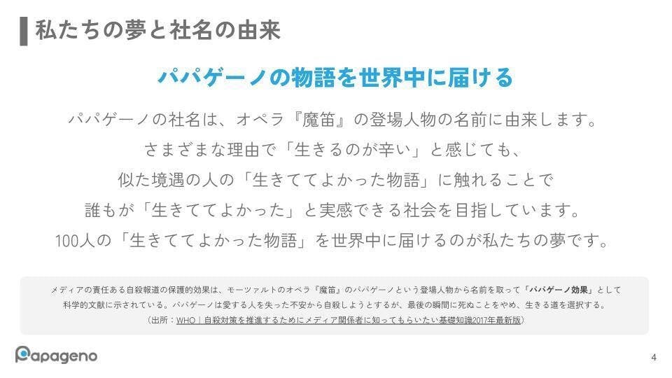 100人の「生きててよかった物語」を世界中に届けることで、メンタルヘルス不調や精神疾患を経験しても「生きててよかった」と誰もが実感できる社会の実現に貢献します。また、自殺を踏みとどまった人の物語に触れることが自殺の抑止効果を持つかもしれないという「パパゲーノ効果」を実証し、拡充することを目指しています。