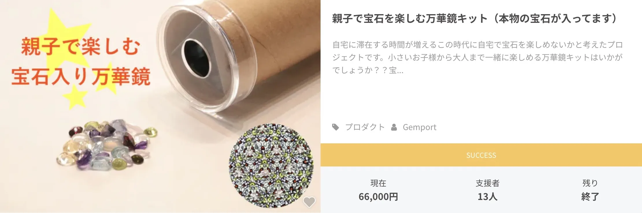 2022/06/27 16:20この度は当プロジェクトにご興味を持って頂きありがとうございます。このプロジェクトは親子で楽しめるをコンセプトとしたプロジェクトになります!今まで宝石は大人になってからしか楽しめない嗜好品のイメージが強かったですがたくさんのメーカーさんの頑張りによって宝石の展示会やミネラルマルシェなどが開かれ、その会場に親子で出かける方や親御さんが集めているのを見て興味をもつお子様が増えてきました。私たちもこのようなことができたらと思い去年から「親子で楽しむ宝石万華鏡作り」と題して老若男女とわず宝石を楽しんでもらえる企画として続けております。今回は開始2日で目標を達成することができました。改めて皆様にお礼申しあげます。そして、近日中に目標達成を記念した特別リターンを追加予定ですのでお楽しみにお待ちください。プロジェクト終了まで少しでも多くの方に喜んでいただける様頑張って参りますので引き続き応援の程よろしくお願いしたします。 もっと見る