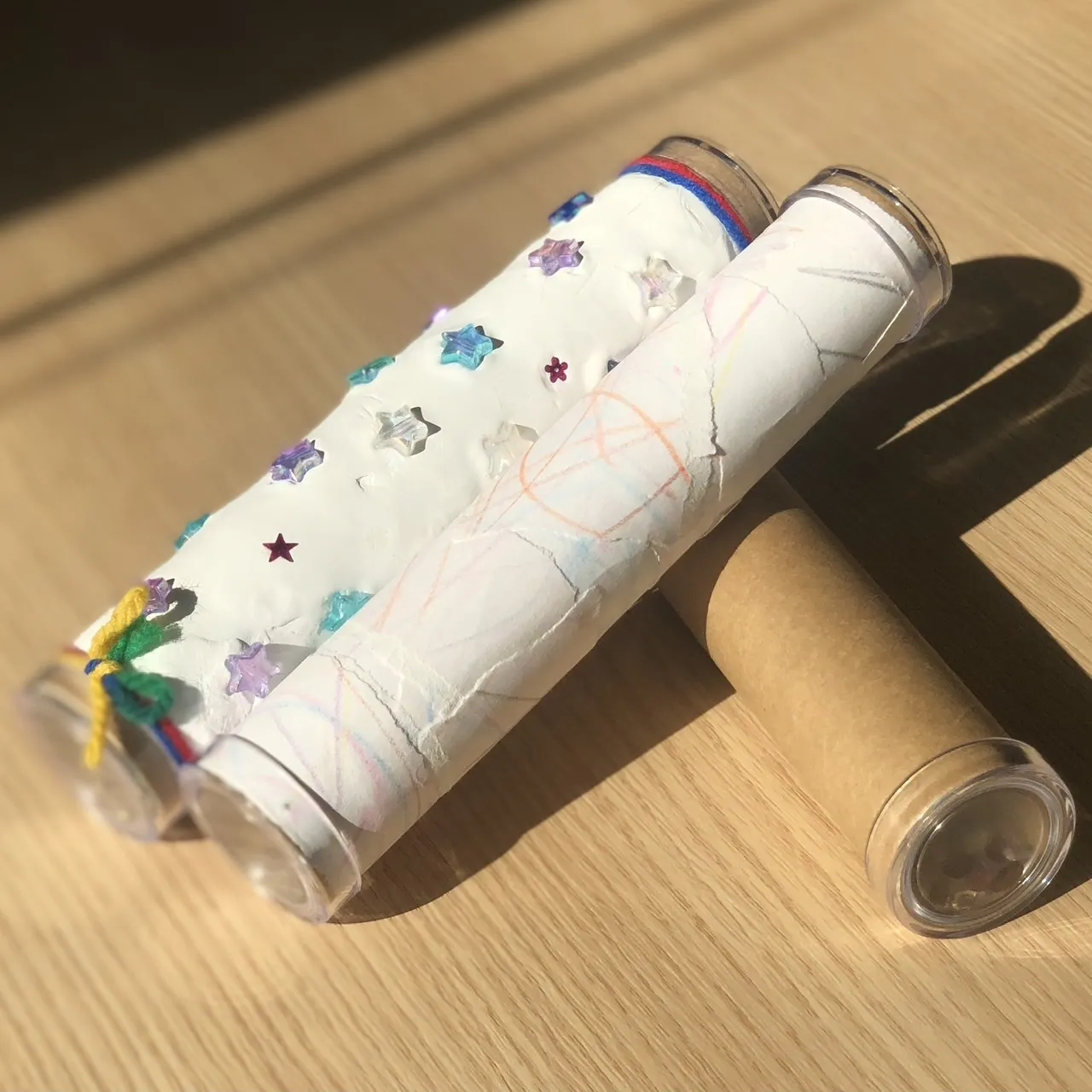 実際の完成品です♪一生懸命作る姿や、綺麗に光る万華鏡を眺めて興奮しっぱなしでした。