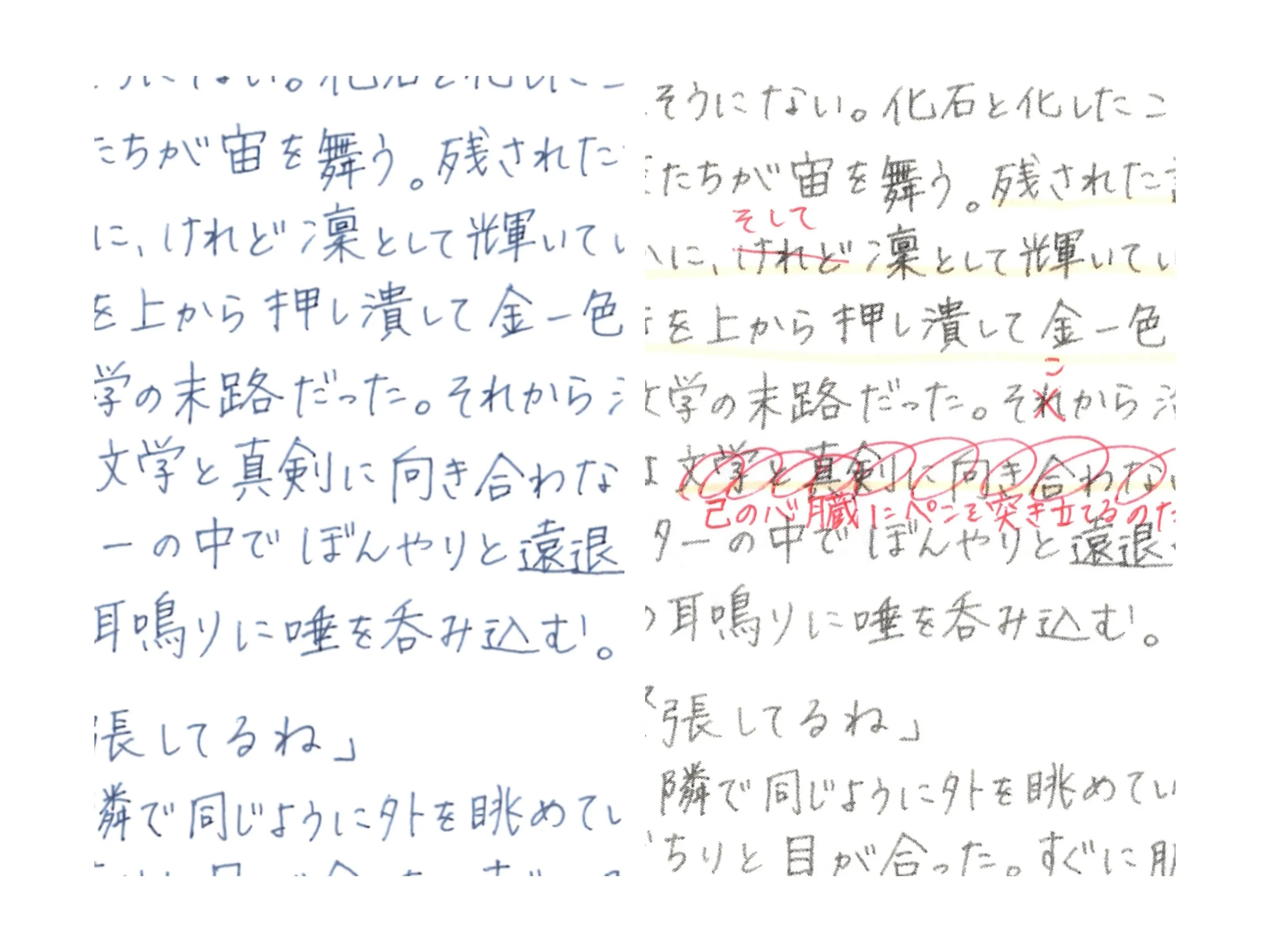 左が修正前、右が修正指示です。訂正以外にも、執筆の上での考えの変化も書かれています。