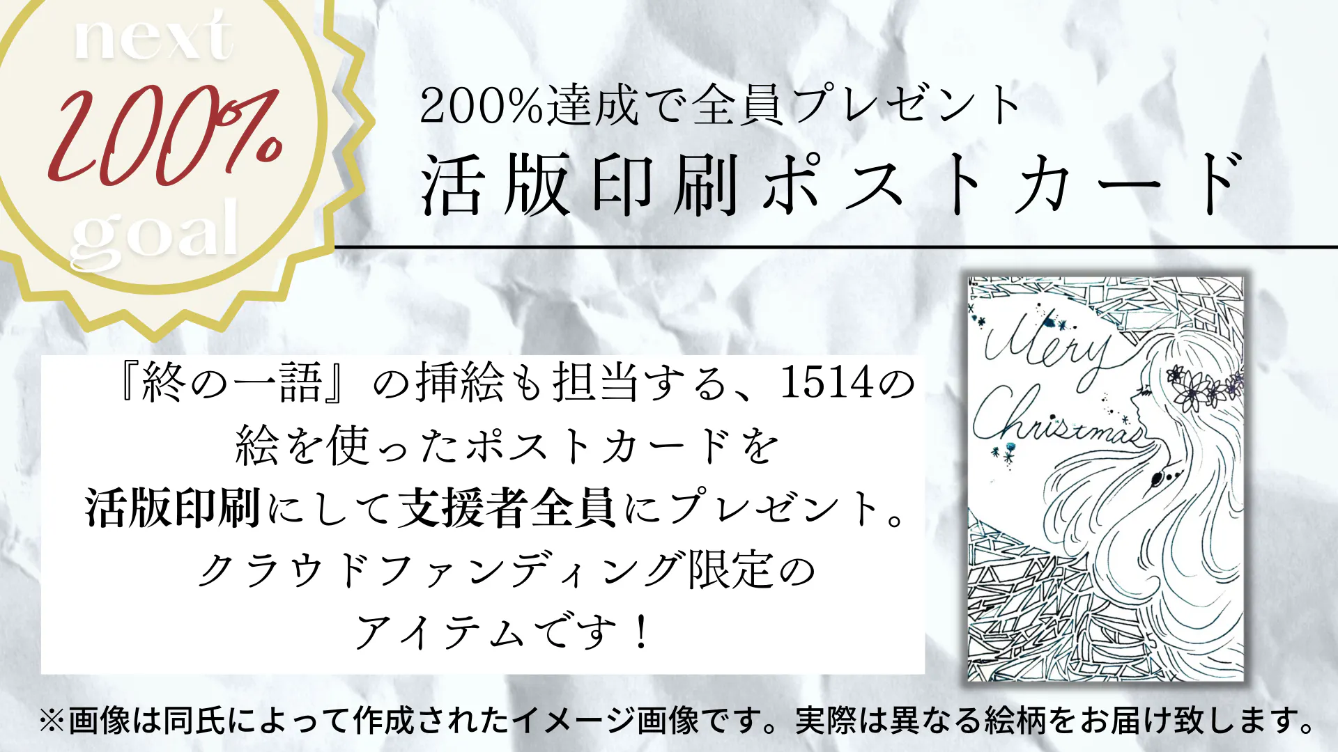 支援者の方全員に、『終の一語』の挿絵を担当する1514によるポストカードをプレゼントいたします。このポストカードは、活版印刷で作成する予定です。