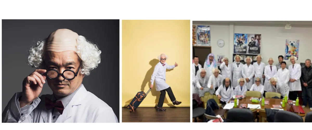 この「おもしろアイデア研究所」で使っている博士の格好を使い、100名の参加者に衣装を提供して姫路駅から姫路城まで行進をします。記念撮影会も行います。