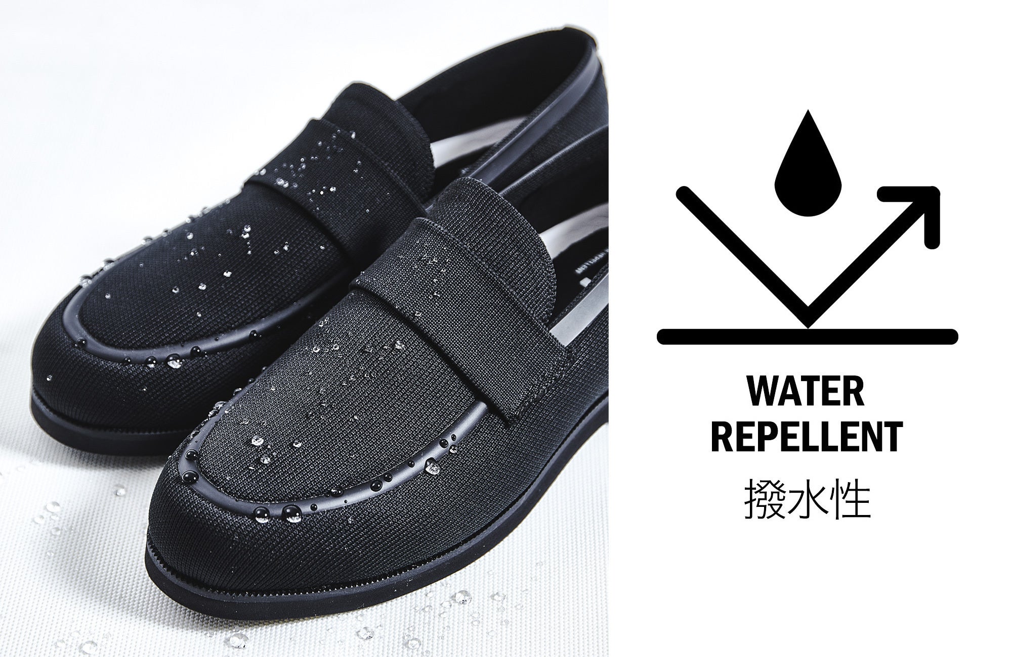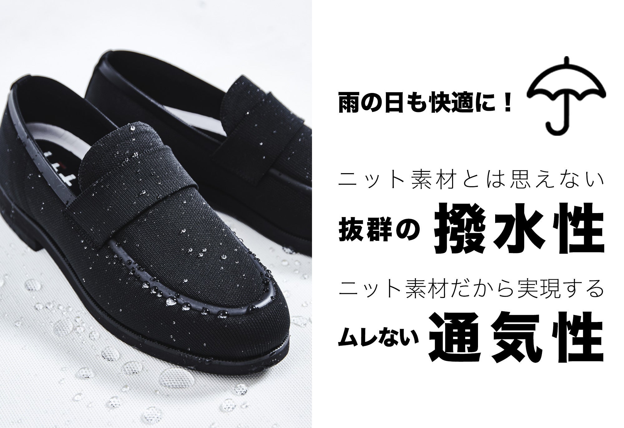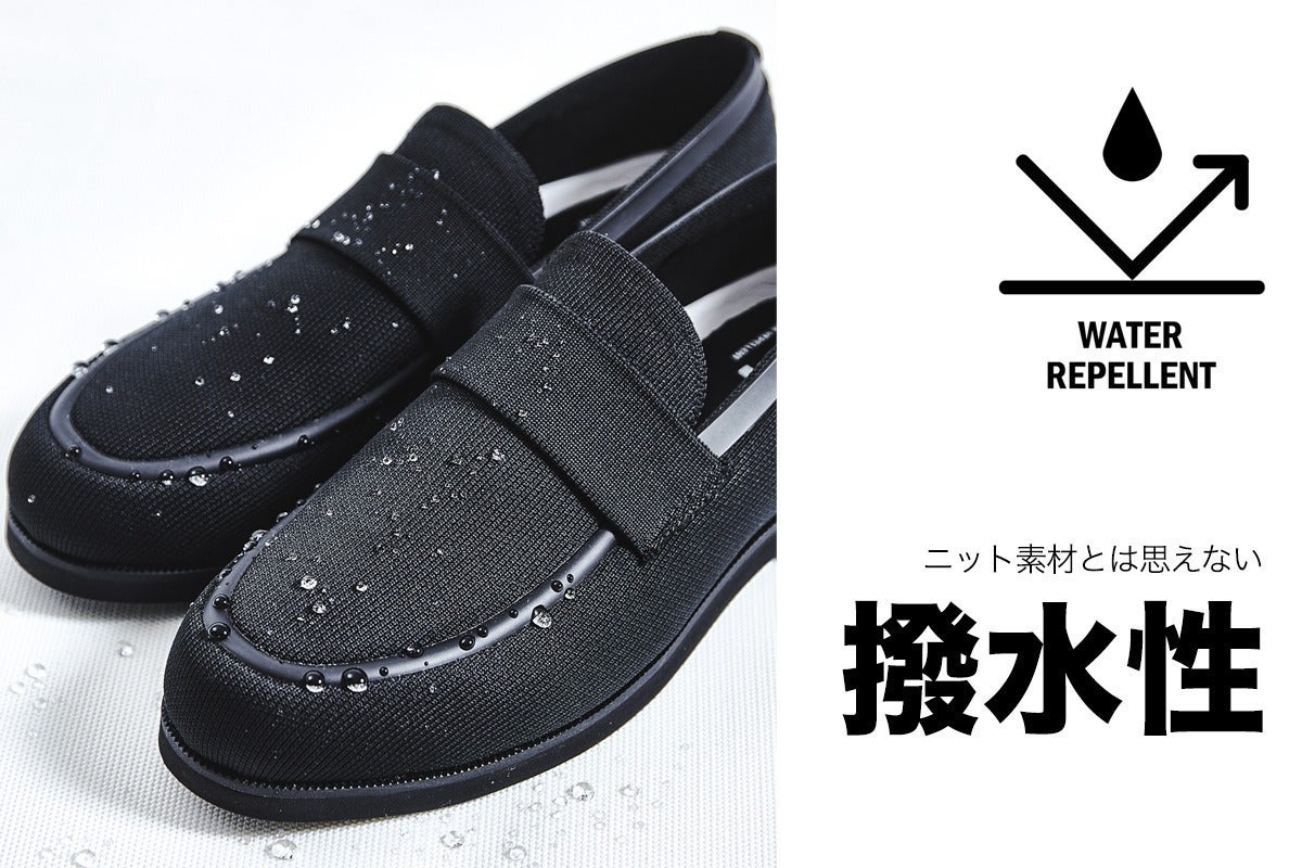 あなたはこれまで、シューズの不快な蒸れに悩んだり、雨の日の靴選びに困ったことはありませんか?さらに面倒なお手入れからも解放されるとしたら、このシューズを選んでみませんか?水に強く、蒸れにくく、歩きやすい。革新的な最新テクノロジーを搭載したニット素材のシューズが誕生。一日中履いていても蒸れにくい通気性と速乾性、歩き回る日に楽チンな軽量性、急いでいる時にもパッと走れる伸縮性、突然の雨にも困らない撥水性。しかも、汚れてしまったら簡単に自宅で洗濯ができます。爽快に仕事ができて、見た目もスマートな、活躍必至の一足です。