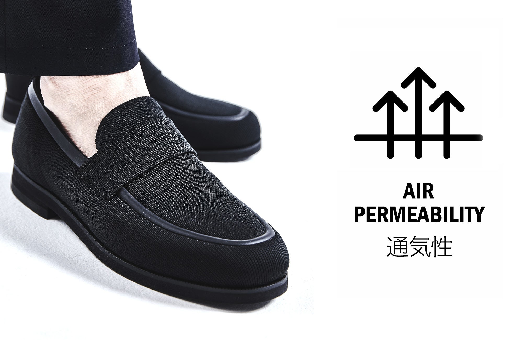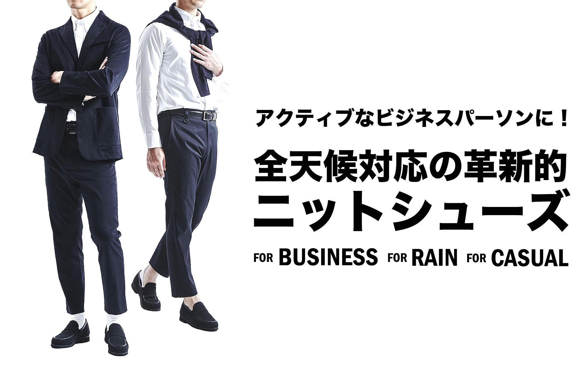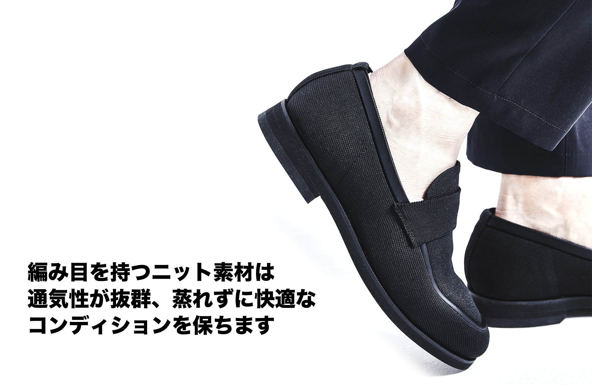あなたはこれまで、シューズの不快な蒸れに悩んだり、雨の日の靴選びに困ったことはありませんか?さらに面倒なお手入れからも解放されるとしたら、このシューズを選んでみませんか?水に強く、蒸れにくく、歩きやすい。革新的な最新テクノロジーを搭載したニット素材のシューズが誕生。一日中履いていても蒸れにくい通気性と速乾性、歩き回る日に楽チンな軽量性、急いでいる時にもパッと走れる伸縮性、突然の雨にも困らない撥水性。しかも、汚れてしまったら簡単に自宅で洗濯ができます。爽快に仕事ができて、見た目もスマートな、活躍必至の一足です。