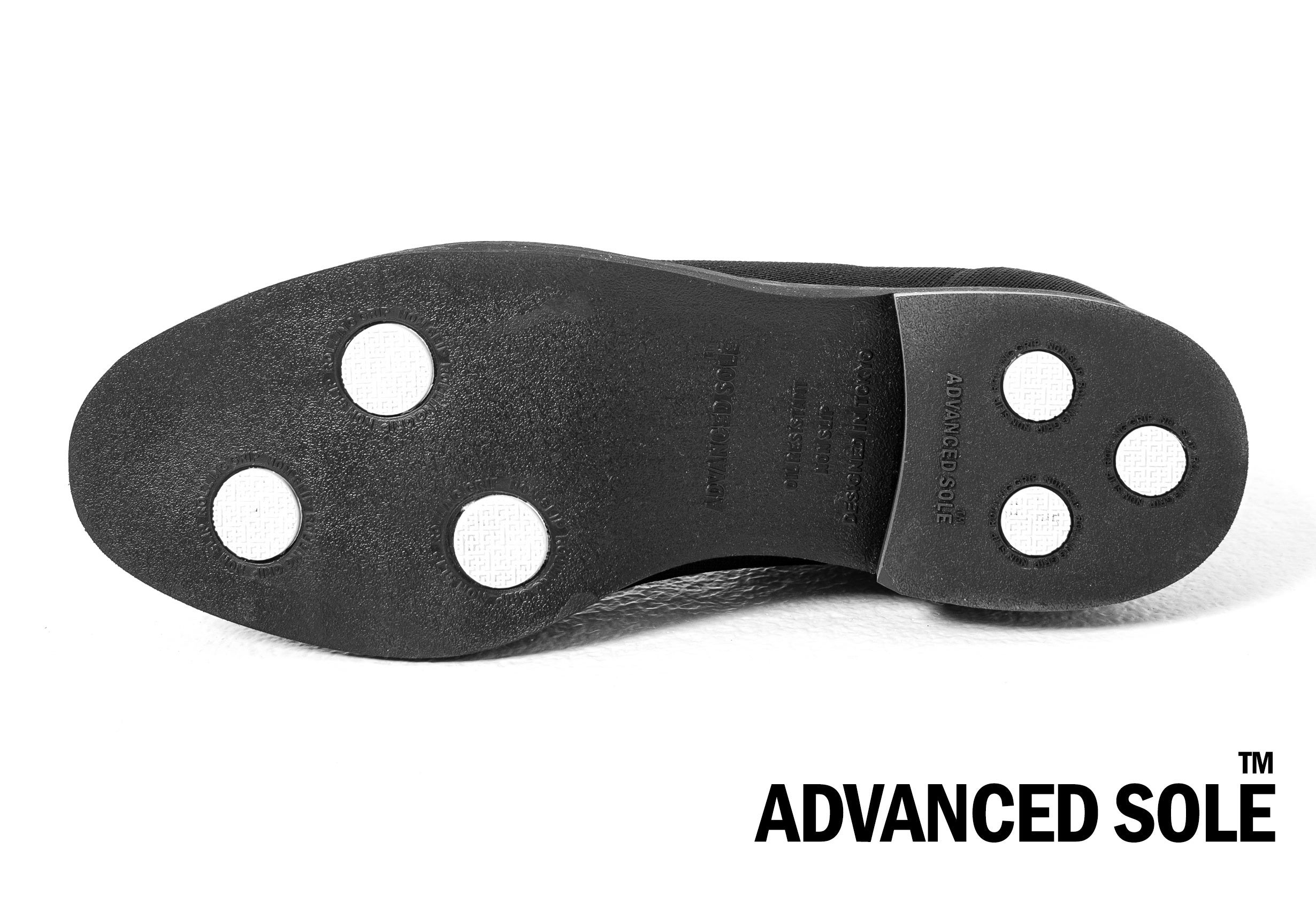 アウトソールには歩行時の動きに基づいて設計された〈ADVANCED SOLE(アドバンスドソール)〉を採用。軽量かつ衝撃吸収性に優れた発泡ゴムをベースに、耐摩耗性の高い硬質ゴムを適所に配置。クッション性とグリップ性を同時に備えているのが特徴です。特にかかと部分には摩耗に耐える素材配合になっています。水はけがよく、雨の日のはき心地も快適です。