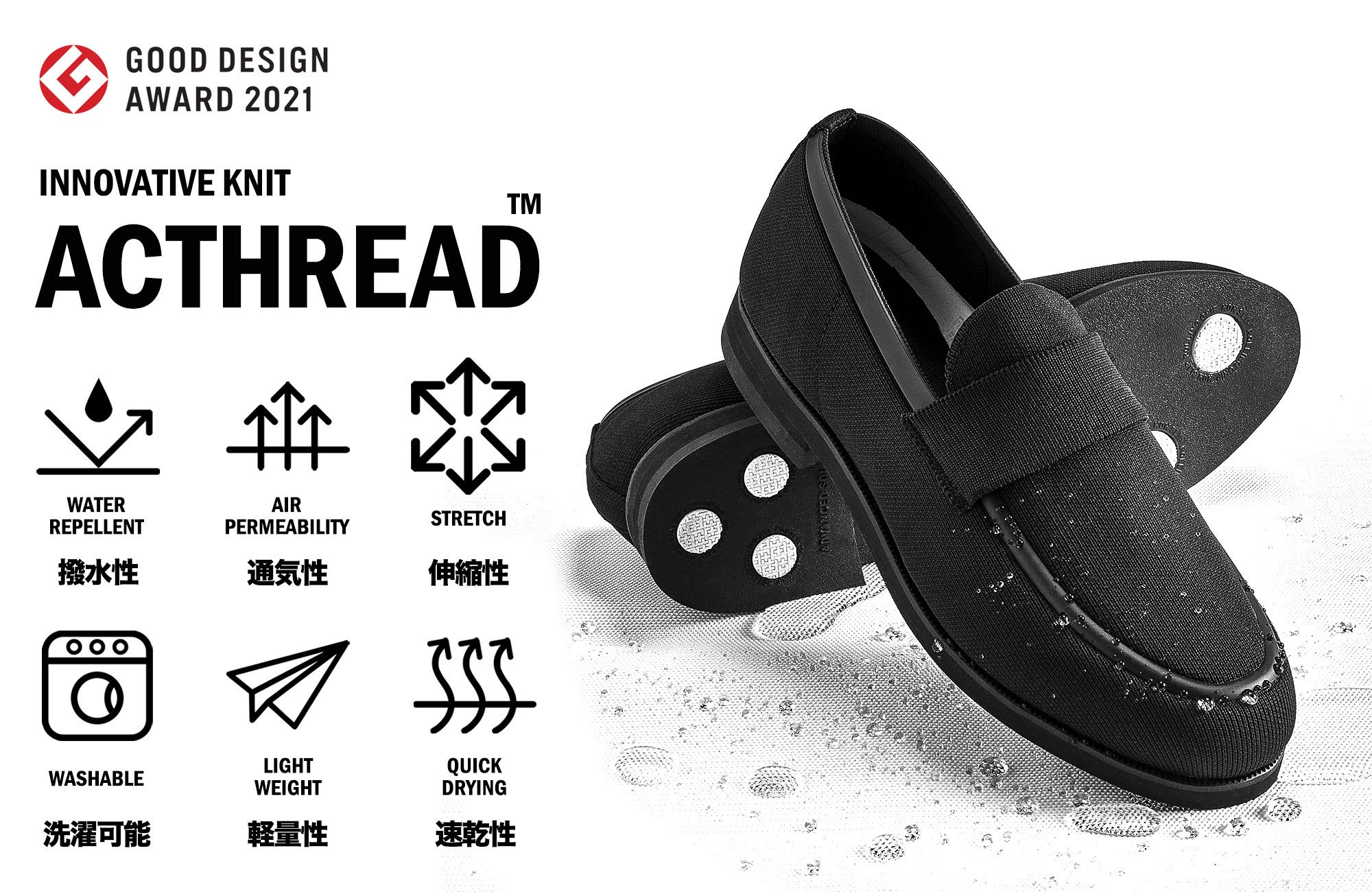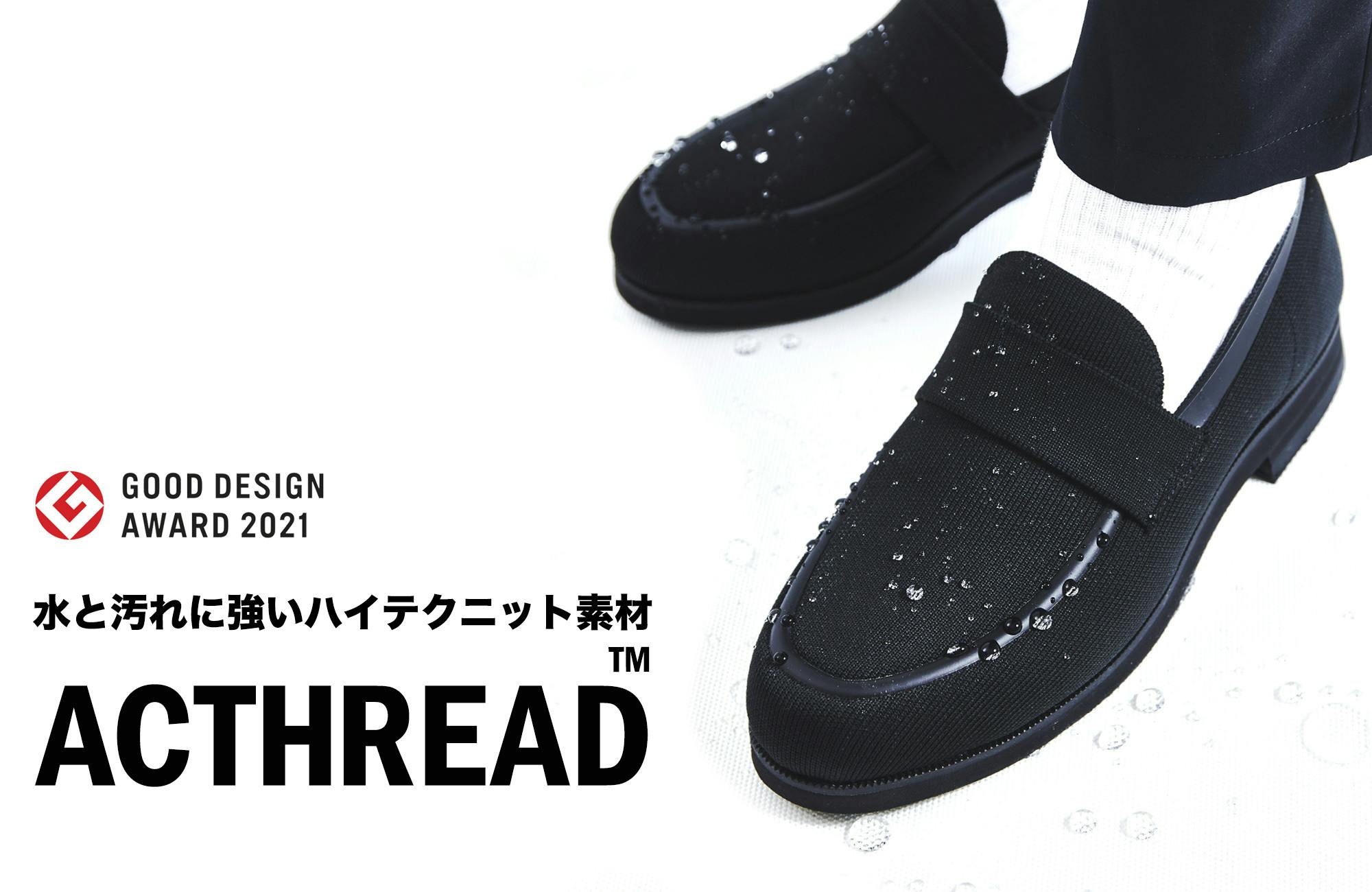 糸の状態から撥水加工を施して編み上げた独自のニット素材〈ACTHREAD TM(アクスレッド)〉を採用。水の持つ表面張力を利用する特殊な加工で、水だけでなく汚れに強いのもポイント。繰り返し洗っても撥水性が弱まりにくいのが特徴です。この1足があれば、もう雨の日のためのレインシューズを備えておく必要はありません。