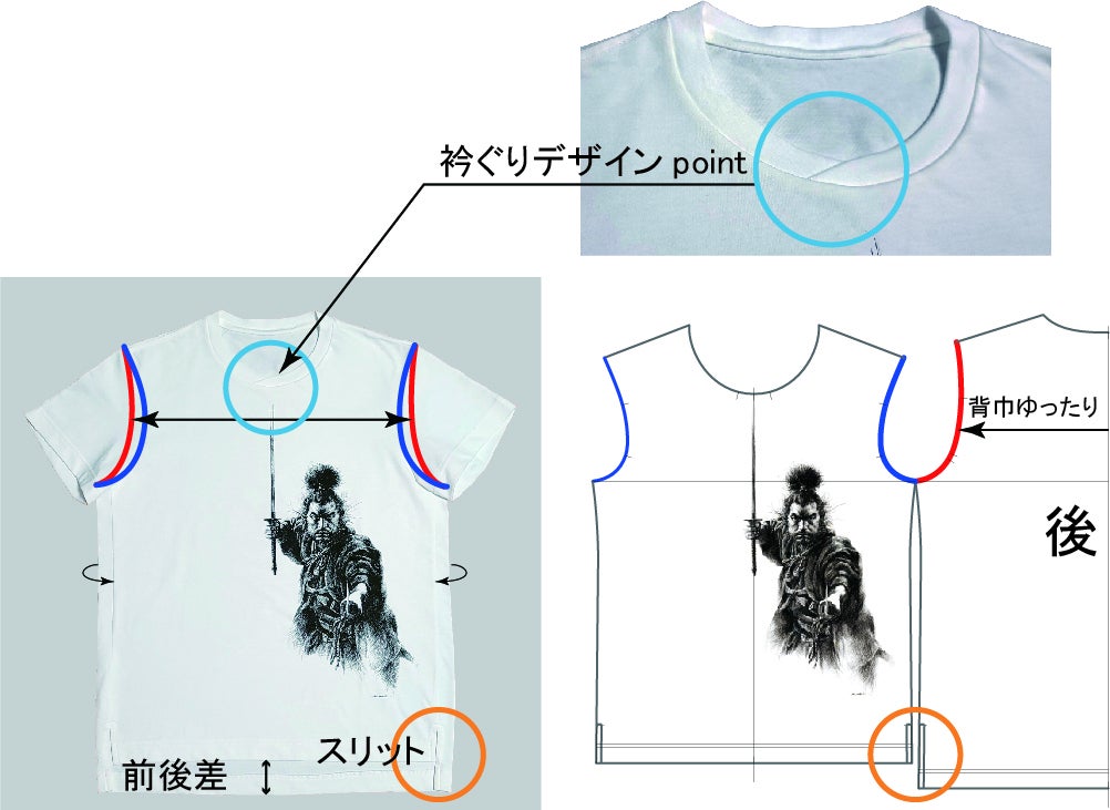 着用時のシルエットの良さは勿論の事、運動性も考慮したデザイン。袖ぐりもこだわりの設計。椅子に座ったり、前かがみになった時にも脇にスリットを入れお腹がもたつかないように配慮。後丈を長くお尻をカバー。更に着物の前合わせを連想させる衿ぐりがデザインポイント。