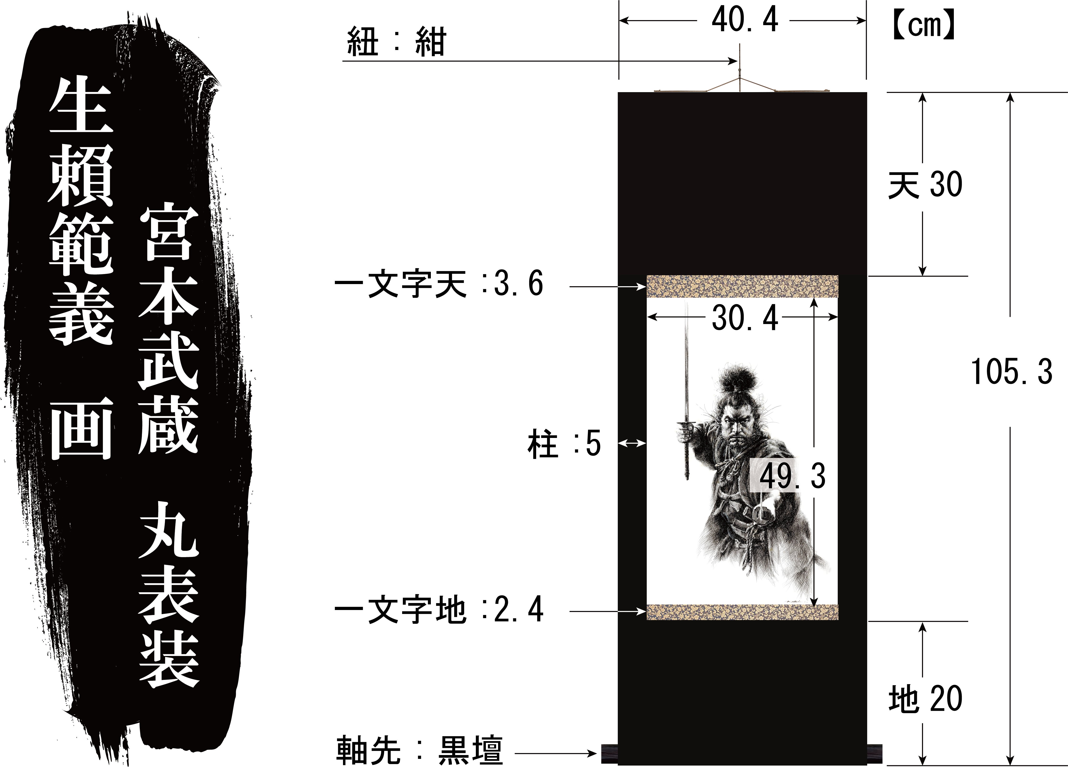 『剣豪 宮本武蔵』に相応しい表装として『丸表装』を選択。作品本紙との取り合わせで最も重要な上下一文字以外を同じ生地で仕立てた、風帯もないシンプルな表装で絵の勢い、迫力を押し出した掛け軸になります。