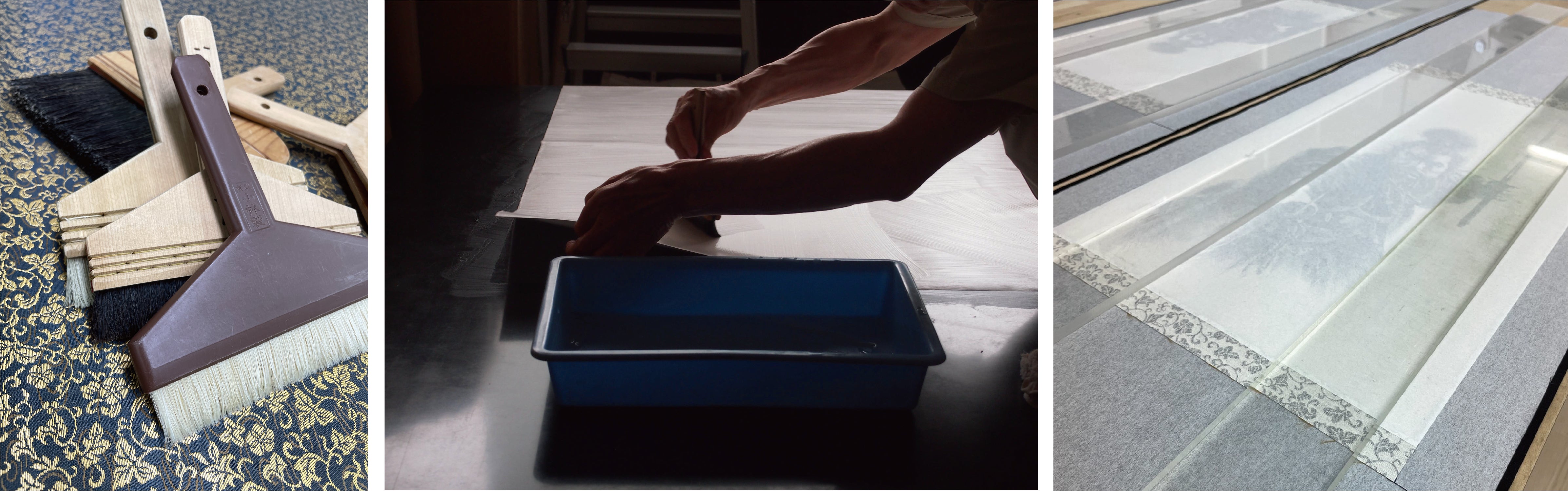 本紙のしわを伸ばし、和紙を作品の裏側に張り付ける作業