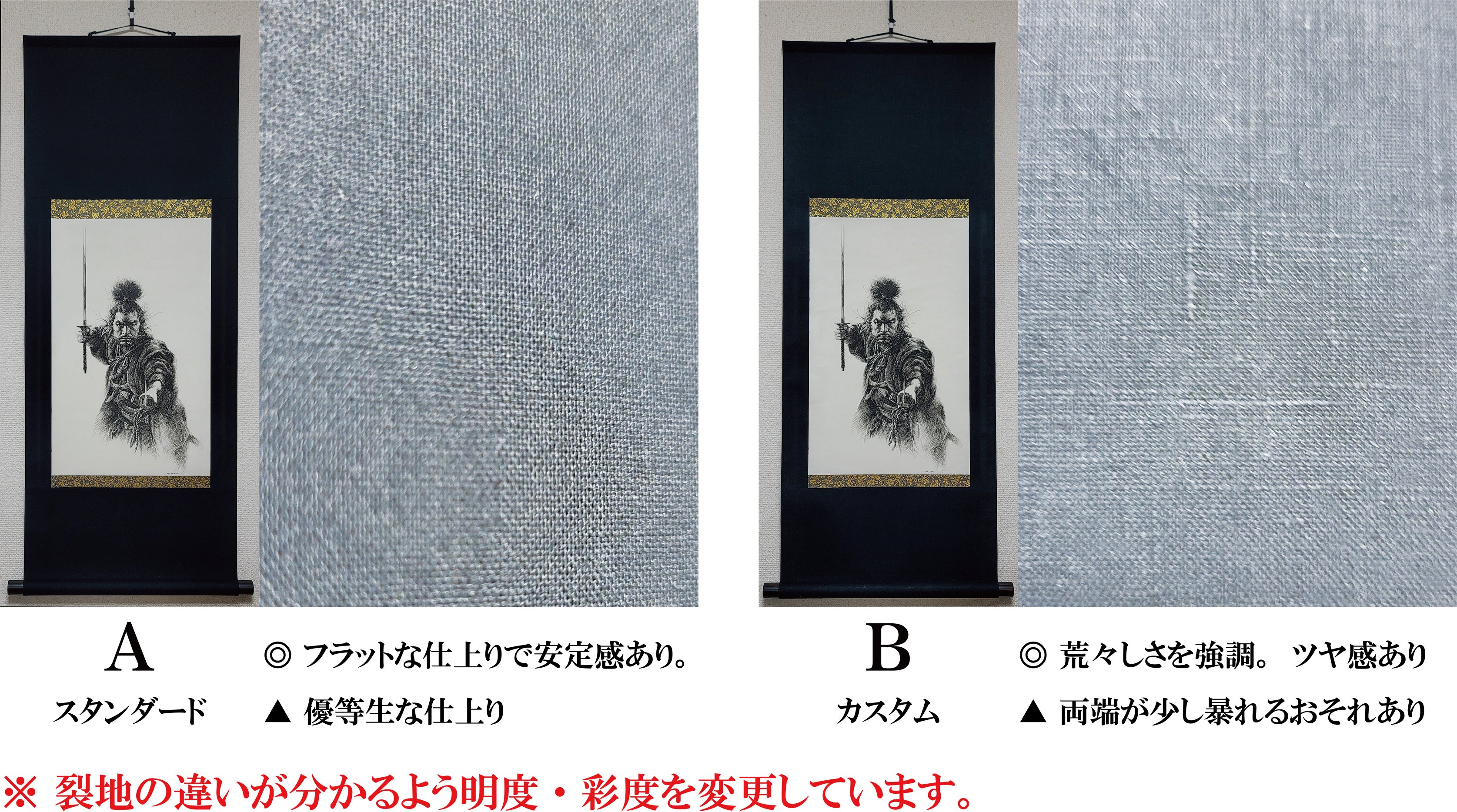 リターンでは常識にとらわれず、【A・B】2タイプの表装裂地を用意。メリット・デメリットを記載しております。A・Bいずれも宮本武蔵のイメージから粗野な素材を使用して渋く存在感のある仕上がりです。