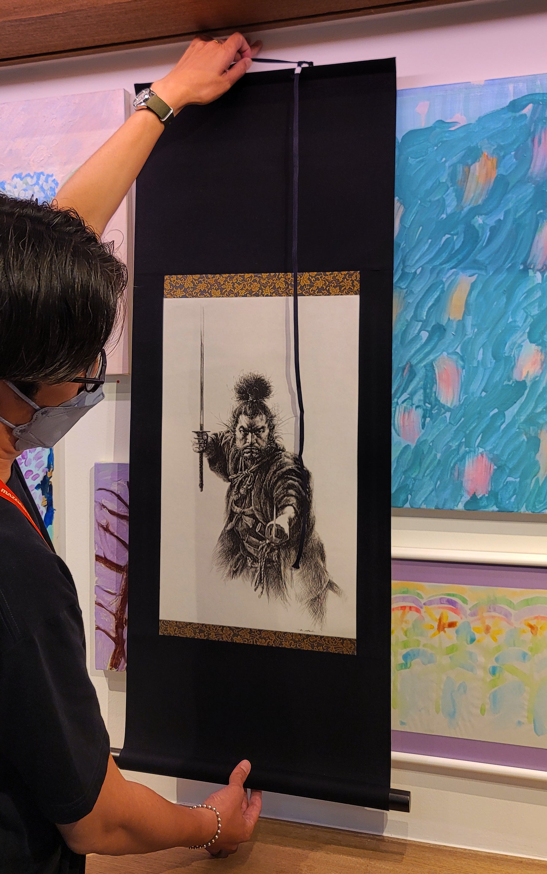 絵を観ていただく為に額装も考えましたが、宮本武蔵のイメージからも掛け軸にした方が渋みが増して良さそうということが最初の動機でした。企画のとっかかりの部分です。