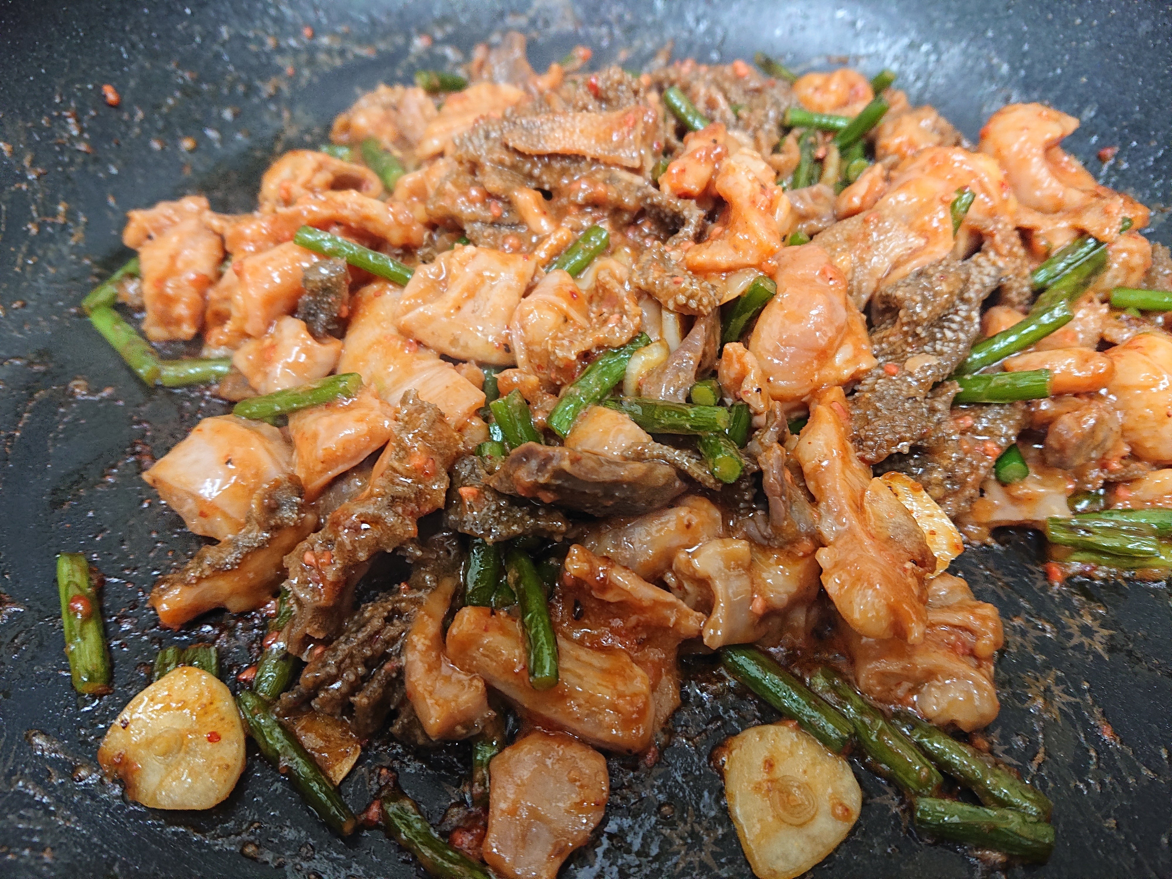 摘み取ったニンニクの花芽は、冷凍していた超甘いニンニクのスライスと混ぜ合わせ「スタミナホルモン焼き」として、ビールのおつまみに!