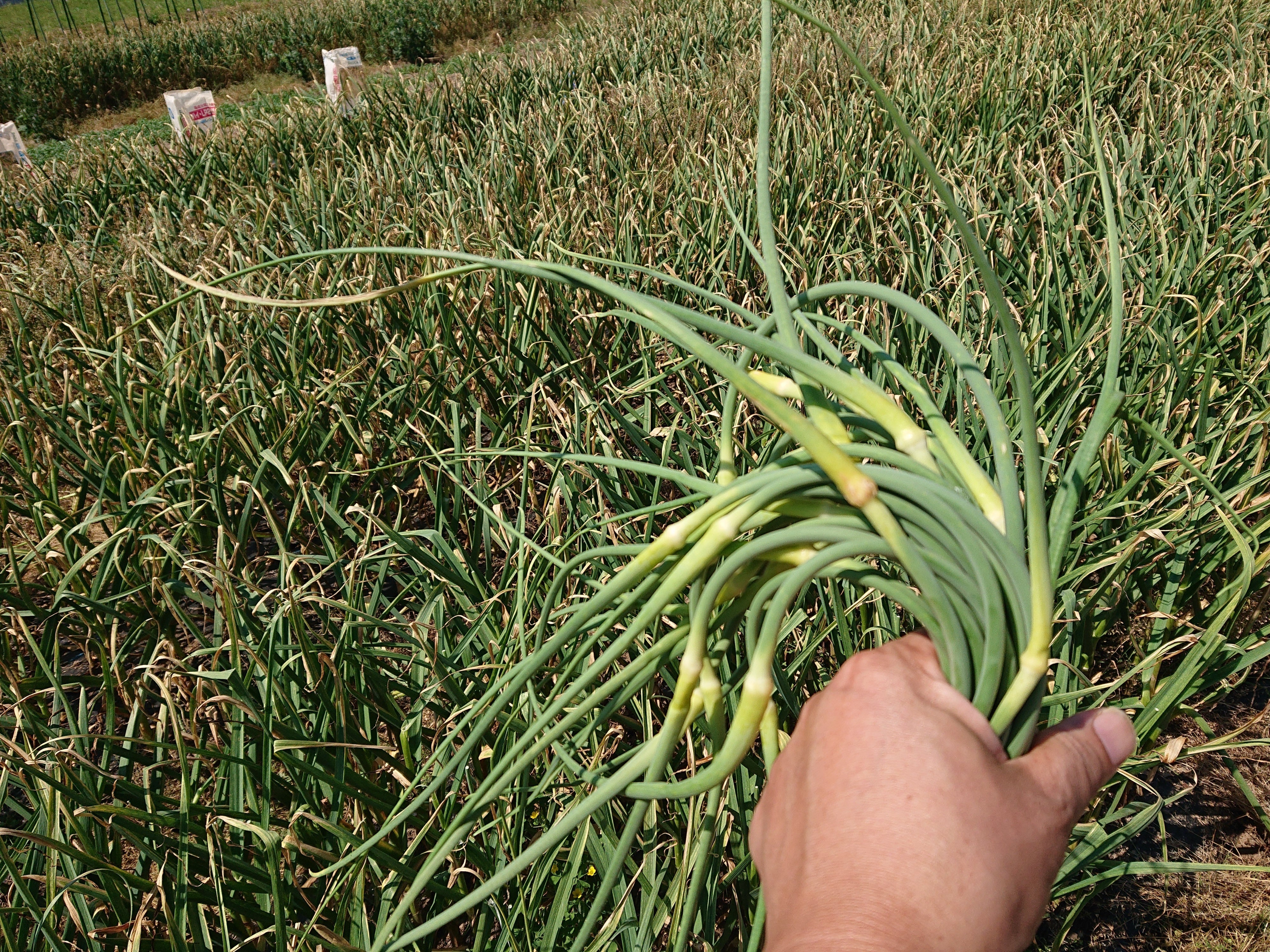 にんにくの花芽摘み、やってます。花芽を摘むと、玉太りが良くなるので欠かせない作業です。