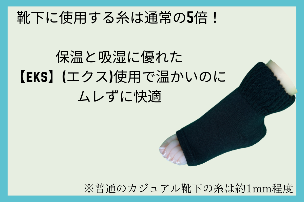 糸自体の太さを活かした生地は、ふわふわで履き心地バツグン!しかも【eks】(エクス)という繊維自体が発熱する特殊素材を使用しているので、冷えやすい足元を温めてくれます。