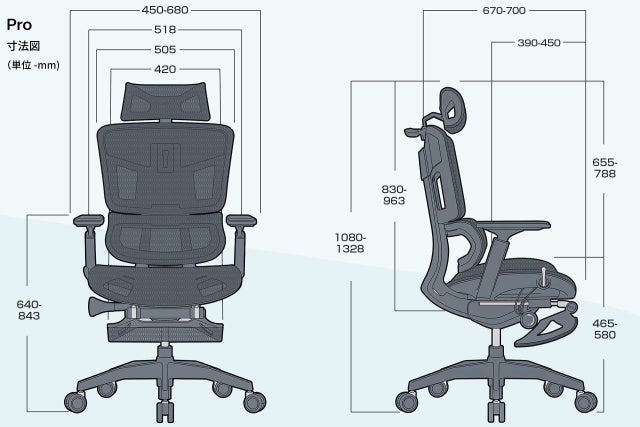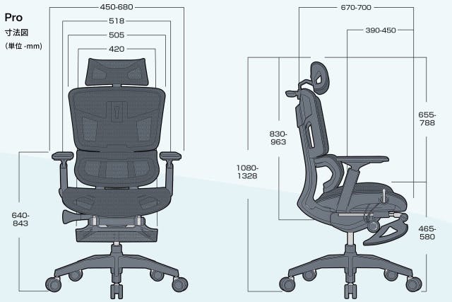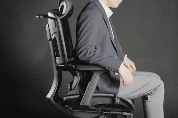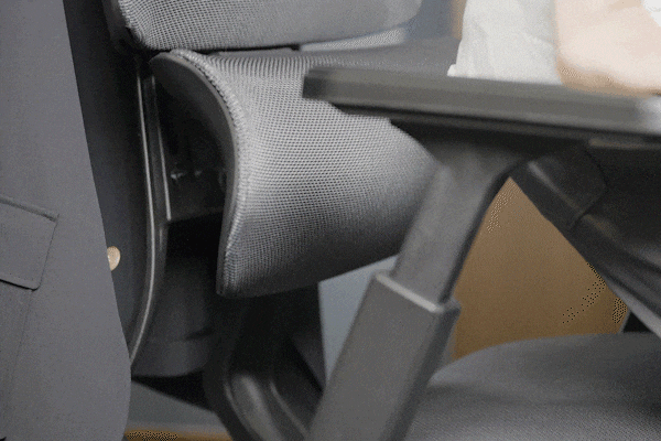 さらに「Pro」には、他にはない前に突き出す事ができるランバーサポート機能がついています。座ったままランバーサポートを前方に5段階、最大2.5cm突き出す事が出来るため、猫背(前傾姿勢)で作業した場合でも、サポート範囲が広く姿勢が維持しやすくなります。
