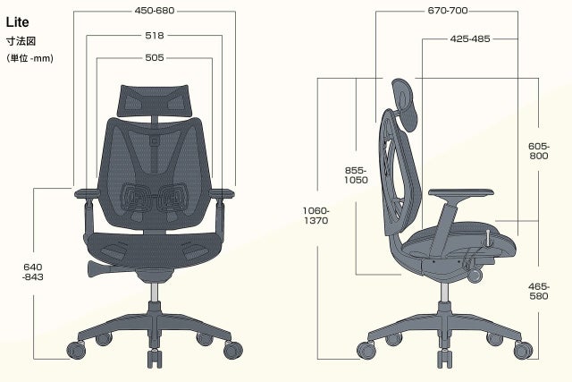Liteのランバーサポートは位置を変更することができませんが、幅広い人にフィットして支えられるように配置しております。背もたれの高さを調整出来るため、ランバーサポートの高さも調整で可能です。