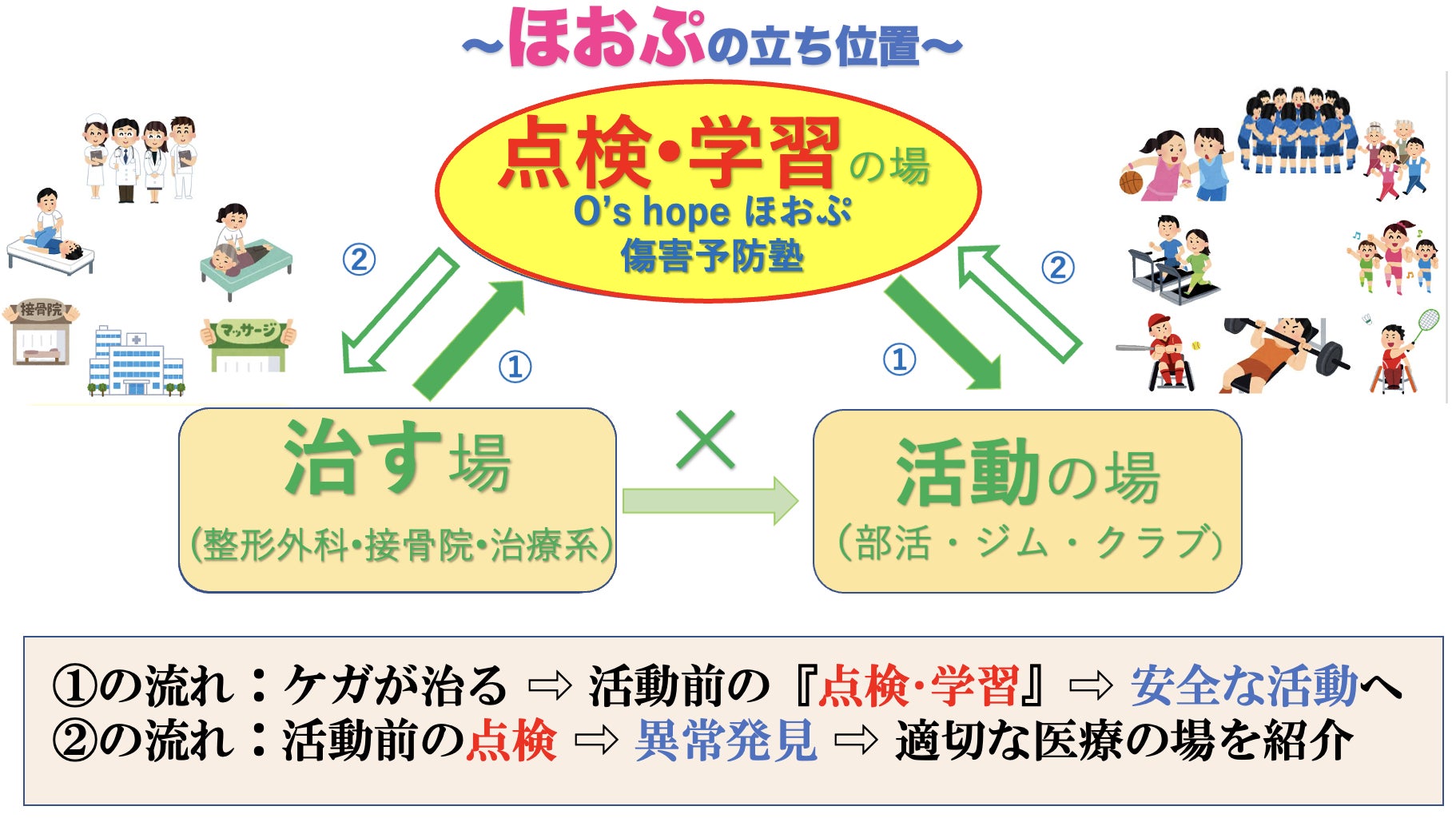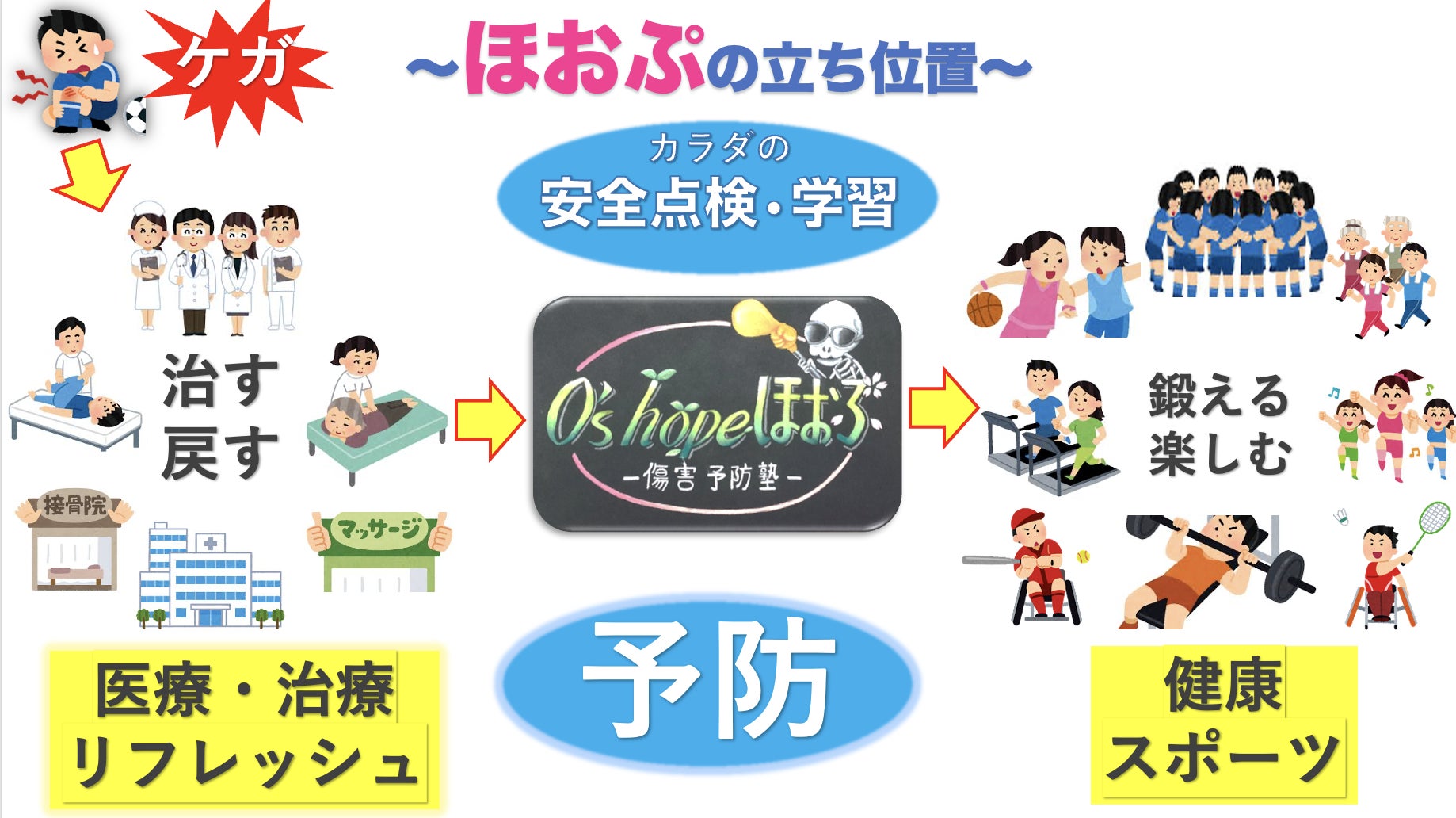 同じケガや痛みでお困りのスポーツ選手や、働き盛りの現役世代の男女には特に、ほおぷのサービスを届けて、今後同じ痛みやケガで苦しむことのないように、健康サポートしたいと考えております。