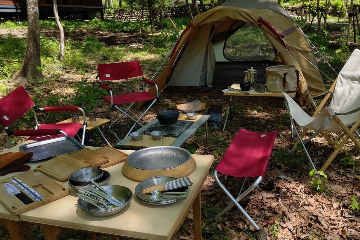 【含まれるもの】ウッドデッキサイト、テント、チェア、テーブル、BBQコンロ(スノーピーク製) 、食器、調理器具類、炭(3kg)テントサイト設営お手伝い、または事前設営