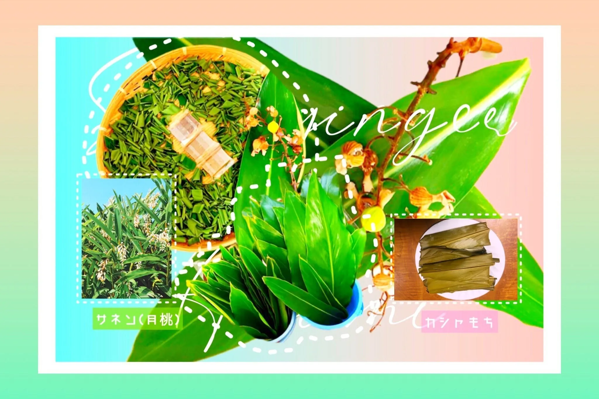 クマタケラン、月桃は、奄美諸島に広く自生しているショウガ科のハーブです。両方とも見た目や効能が類似しており、よく間違われます。奄美では、古くからカシャ(クマタケラン)、サネン(月桃)は、殺菌作用があるとして、おむすびや、かしゃ餅を包む葉に使用されてきました。友人から頂いたかしゃ餅は、とても美味しく、そのカシャ、サネン畑のお婆さんは、生前、尊尊我無と唱え、自然の恵みに感謝して、畑に入って農作業をしていました。その在り方、姿は、とても美しいものでした。奄美の先人達が、自然に畏敬の念を感じ、恵みに感謝して培われた豊かな心と知恵を、私も伝承していきたいと思っています。