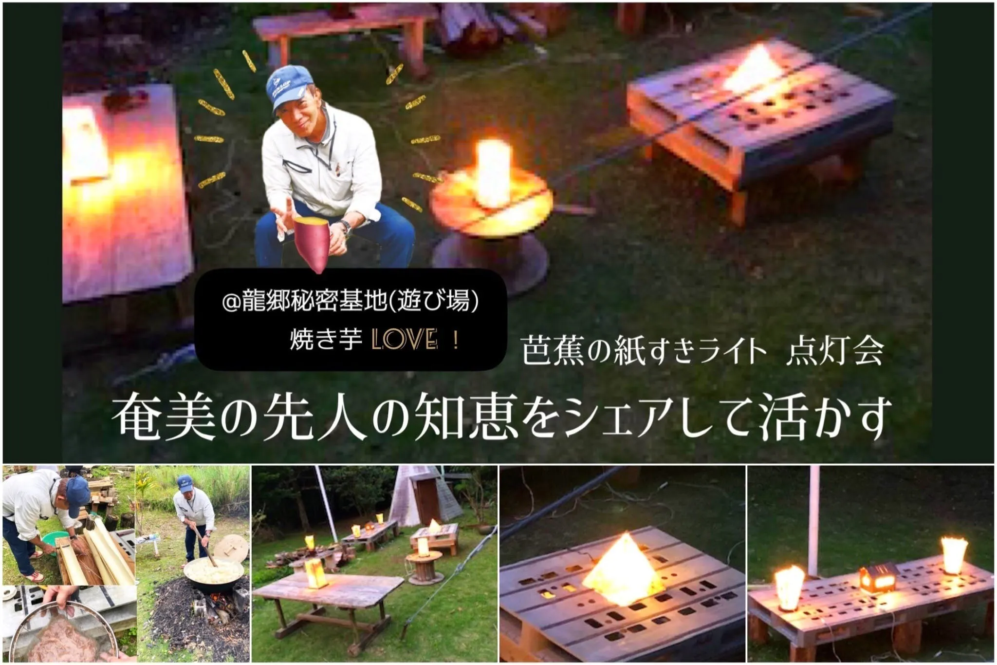 私は、息子(Yuki)が、自閉症児として生まれたことをきっかけに、「息子が、安心して暮らせる地域にしたい」と活動してきました。10年前、知人から「地域のために土地を活用してください」と提案があり、土地を無償でお借りできました。最初は、雑草に覆われ足の踏み場もなかった場所でしたが、多くのボランティアの方々のサポートを受け開墾し、龍郷秘密基地(遊び場)ができました。ミニイベント&コンサート、染め物、焼き芋など、多くの方に利用してもらいました。今年(2022年)5月には、芭蕉の木を伐採し紙すきをして芭蕉ライトをつくり、点灯会をしました。日没と共に温かく輝くライトの光を感じて、とても嬉しくなりました。「息子の為に…」と始めたことは、今では、自分の喜びと生きがいとなっています。大人になっても子供のように遊べる場所がある私は、しあわせ者です。