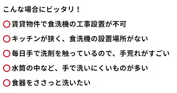 従来の家庭用食洗機に比べ、複雑な工事が一切不要、狭いキッチンコーナーでも設置可能、物を入れてボタンを押すだけで洗浄可能など、様々なメリットをもっています。汚れに手を触れずに洗浄することが可能です。