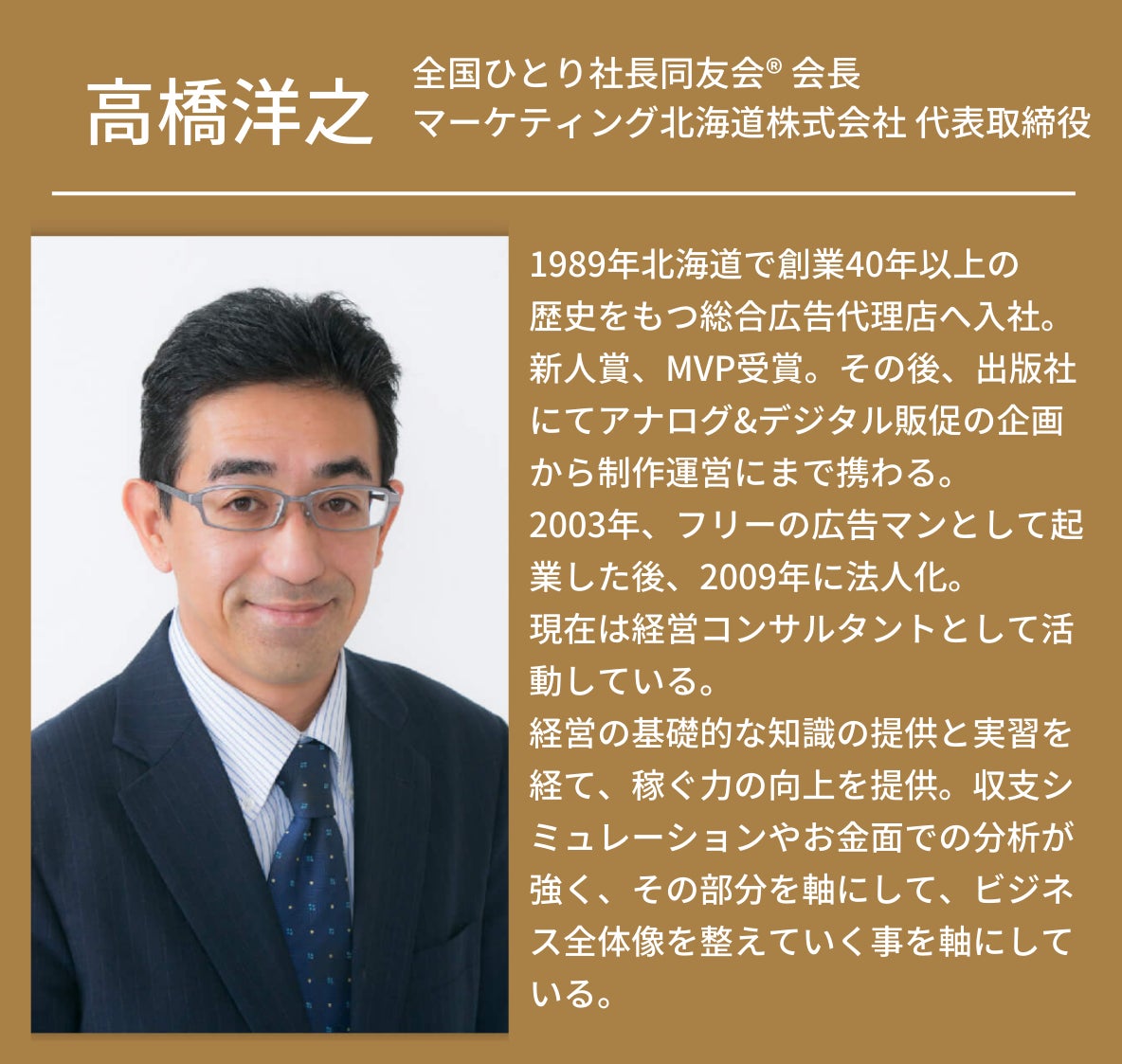 ページをご覧いただきありがとうございます。マーケティング北海道株式会社 代表取締役、全国ひとり社長同友会®︎会長の高橋洋之と申します。