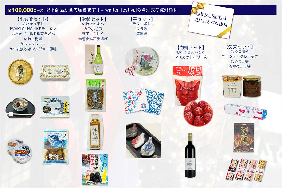 10万円コース:点灯セレモニー(いわき駅前)への参加権といわきの特産品セット(下画像参照)