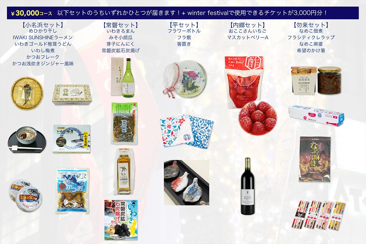 3万円コース :点灯式当日の食のイベントWinter Festivalで使用できる割引券 3000円分といわきの特産品セット(下記画像参照)