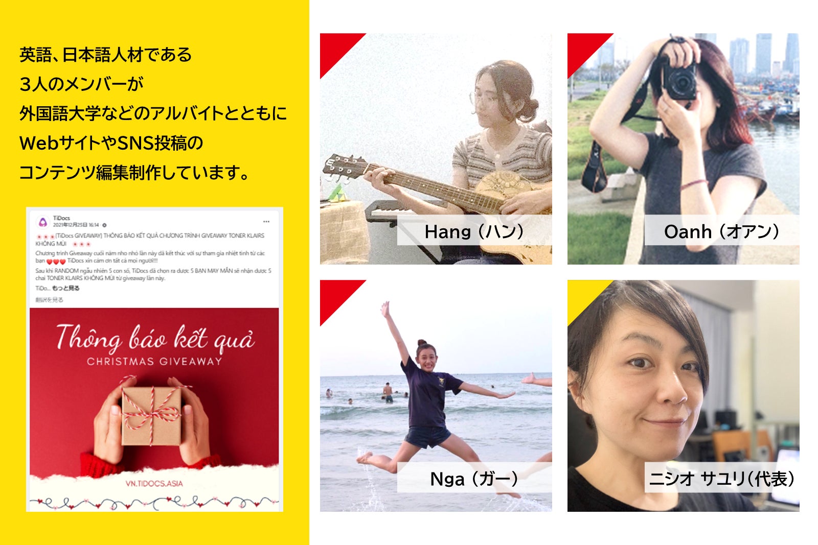 Tidocs designingでは3人のメンバーが、ベトナム国内に向けたコンテンツ制作を行っています。とは言え、私たちが作るコンテンツはデザイン性の高いグラフィックや動画ではありません。Tidocs Designingが目指すのは、日常的に人々が目にするような情報を視覚で分かりやすく伝えること。ソーシャルメディアで配信する画像記事や動画など、日々のコミュニケーションに使われるコンテンツをスピーディに編集制作しお届けすることが得意です。