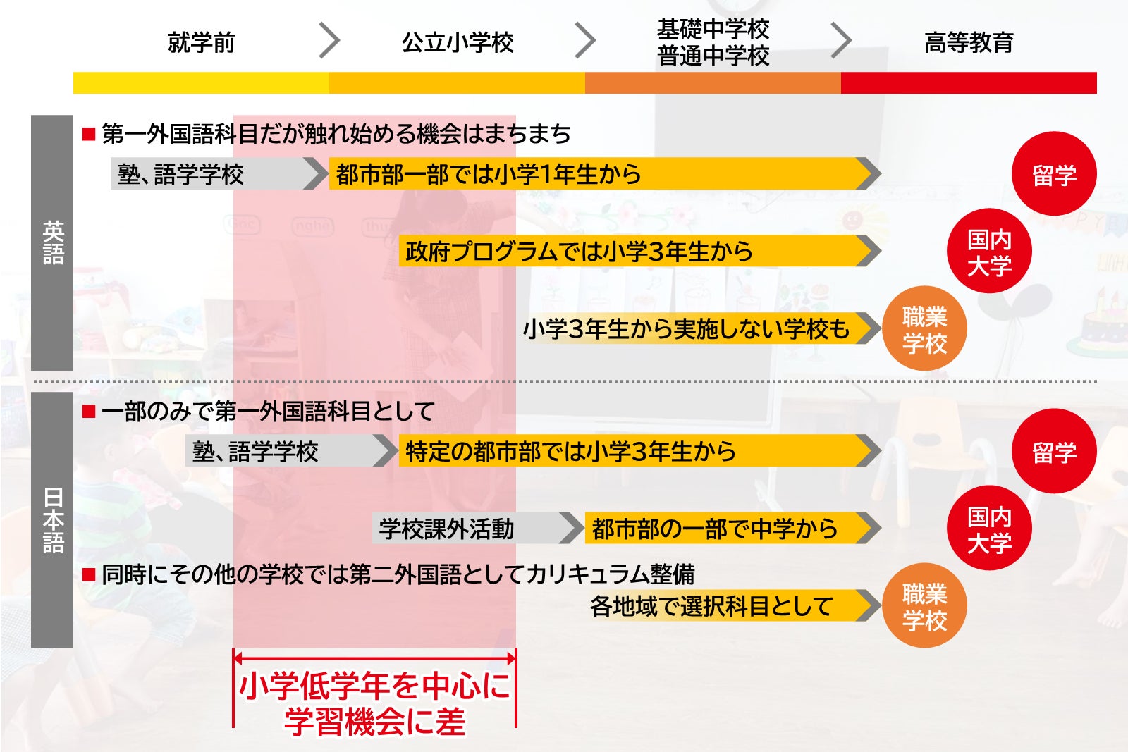 ー 都市部の小学校の一部では小学3年生から日本語教育を行っているが、地域により中学校以降で初めて学習機会がある子どももいる。