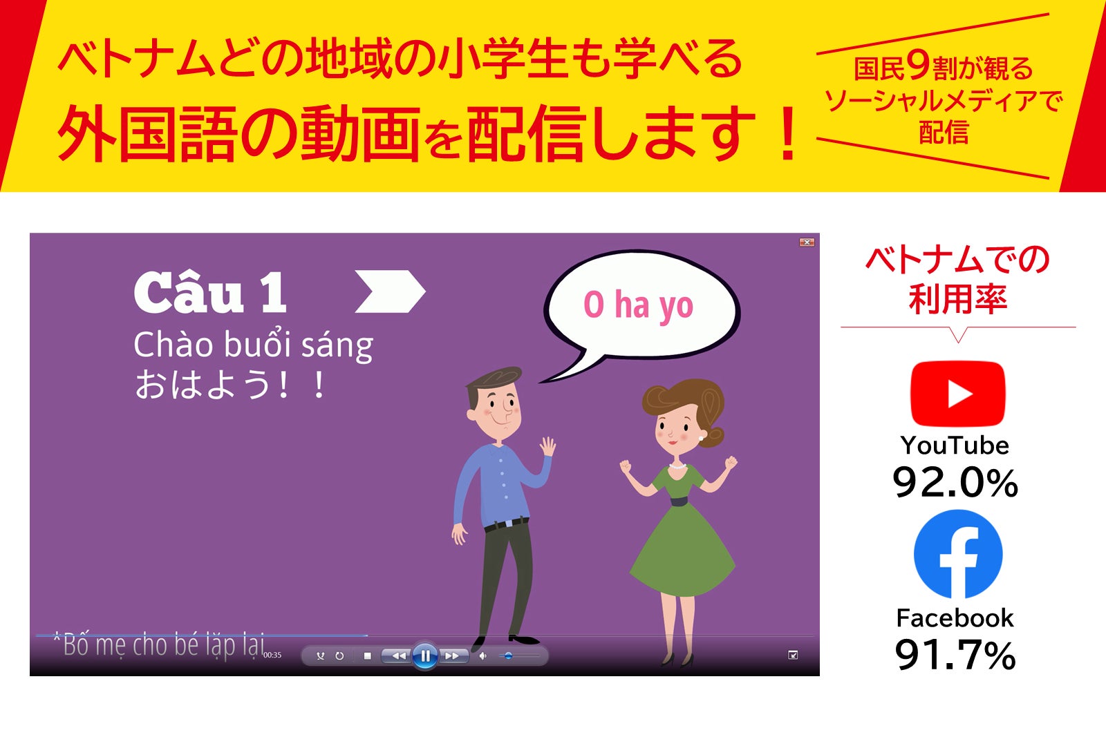 学習機会の地域格差が大きい小学校低学年に向けて、Tidocs Designingの3人のメンバーが外国語大学の学生アルバイトの協力も得ながら、現在学習者の多い英語と日本語に楽しく触れる動画を制作します。そしてベトナム国民の9割以上が利用するFacebookなどのソーシャルメディアを活用し、どの地域からもアクセスできる学び動画を配信します。コロナ禍でオンライン学習が定着したこともあり、都市部も農村部も問わずソーシャルメディアは学びにも抵抗なく活用されやすい状況になっていると私たちは考えています。