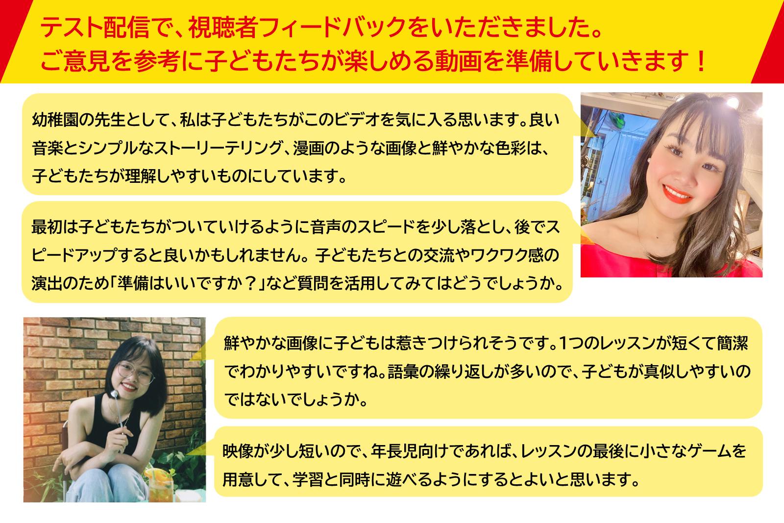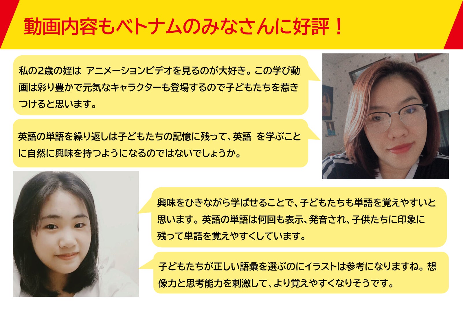 テスト動画を作成し皆さんから感想を集めたところ、興味をひきやすい動画はやはり子どもが外国語に触れる機会として受け入れられそうです。ユーザーの参考にベトナムの子どもたちに愛される学び動画を目指しています。