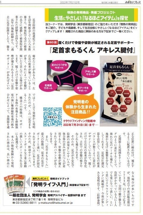2022/07/23 15:18発明学会の推薦商品として『足首まもるくん アキレス腱付』がみまもりプレスという雑誌に掲載されました。掲載ありがとうございます。 膝や股関節、腰や背中、肩、首、肘、足裏のタコ、踵の痛み、アキレス腱の痛み、くるぶしの痛み、足裏の痛み、足の甲の痛み、o脚、xo脚、猫背、反り腰、側弯など足の横アーチの崩れや足の歪みなどと関係しています。ただ、足だけに問題があるわけではなく骨盤や胸郭、頭とすべて連動しています。どれか問題を起こすと全身に波及します。足は体重がかかるため、一度低下したアーチや歪んだ足はなかなかもとに戻りません。手の親指を突き指して曲がると親指に力が入りにくくなるように、足の親指が曲がると踏ん張りにくくなり歩く動作も変わり、これが膝や股関節、腰などに問題を起こす一つの要因です。足が変形して使うべき筋肉が使いにくくなってしまっているのです。それを解決するには、足を補正して使いにくくなった筋肉をリカバーさせていくことです。日頃のセルフケアの指導にも、この思いを反映させて頂いております。 もっと見る【御礼】2日目でプロジェクトの40%を達成しました。