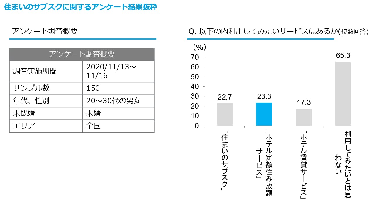 また、20代~30代にアンケートを実施した結果、5人に一人がホテル定額住み放題サービスを利用してみたいと回答しておりHotel Ryokan Lifeをきっかけにホテル暮らしや定期的にホテルや旅館で過ごす時間を増やしていただけたらと思っております。